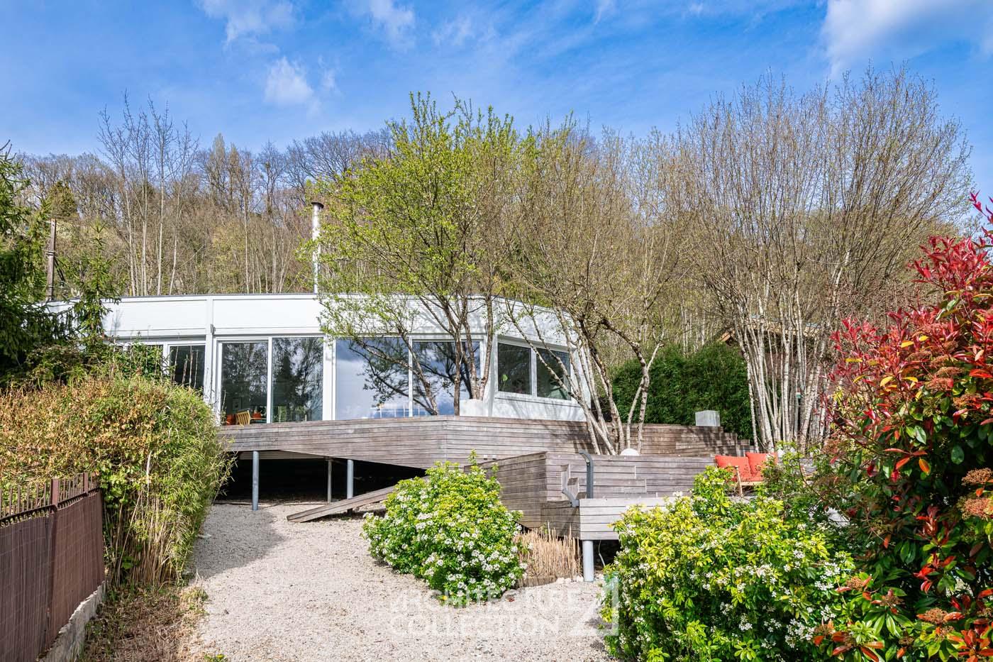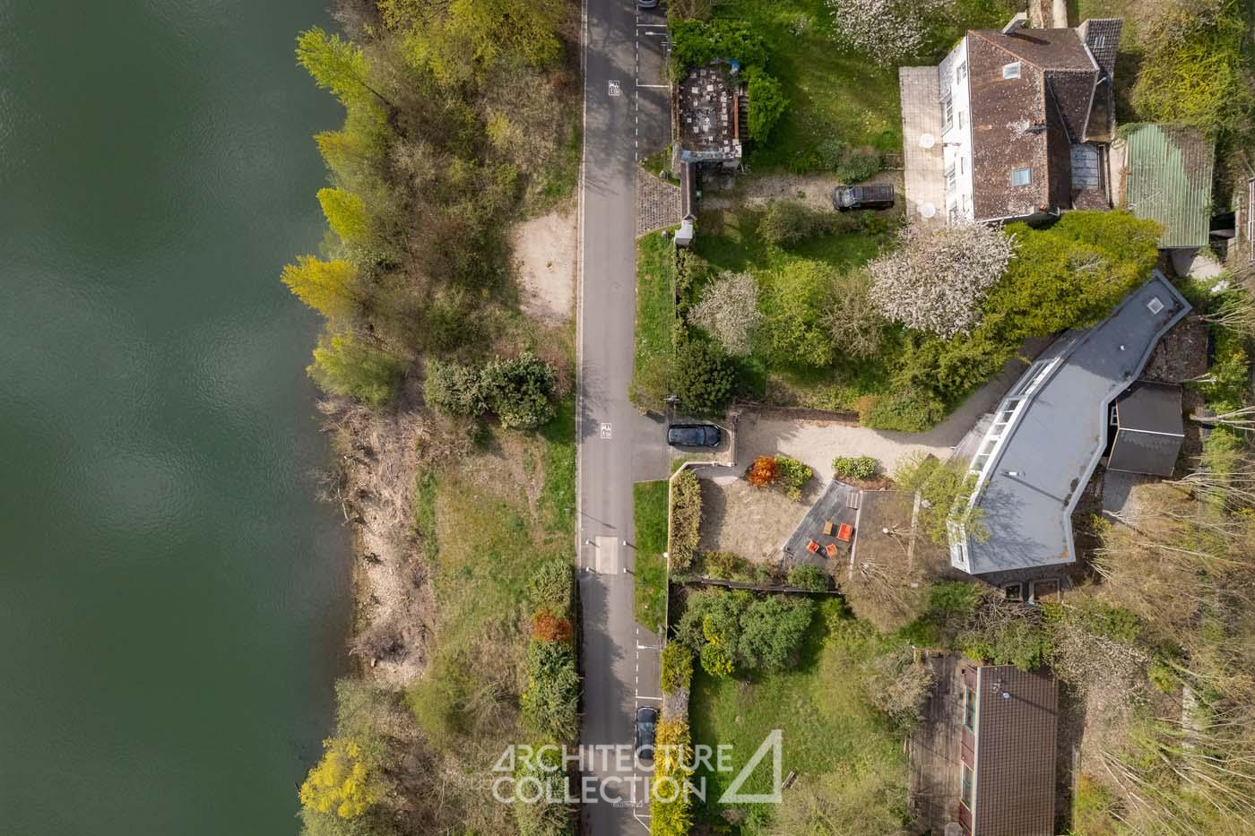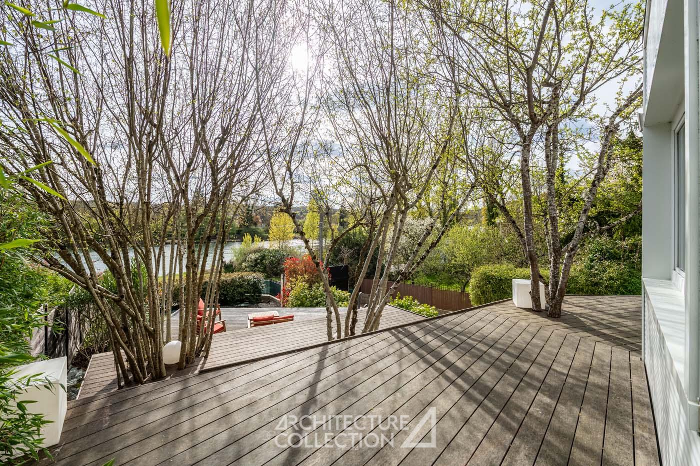 Perchée sur ses pilotis, cette maison de 115 m² prend place au sein d’un terrain paysager de 770 m² sur les bords de la Seine.