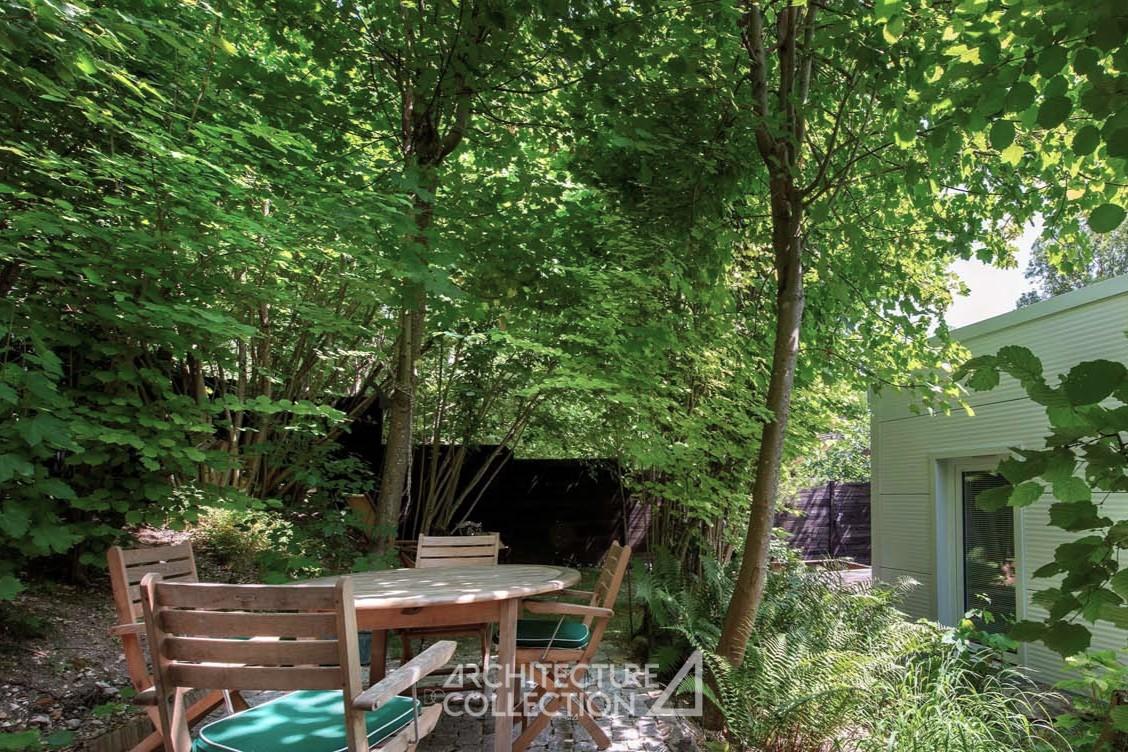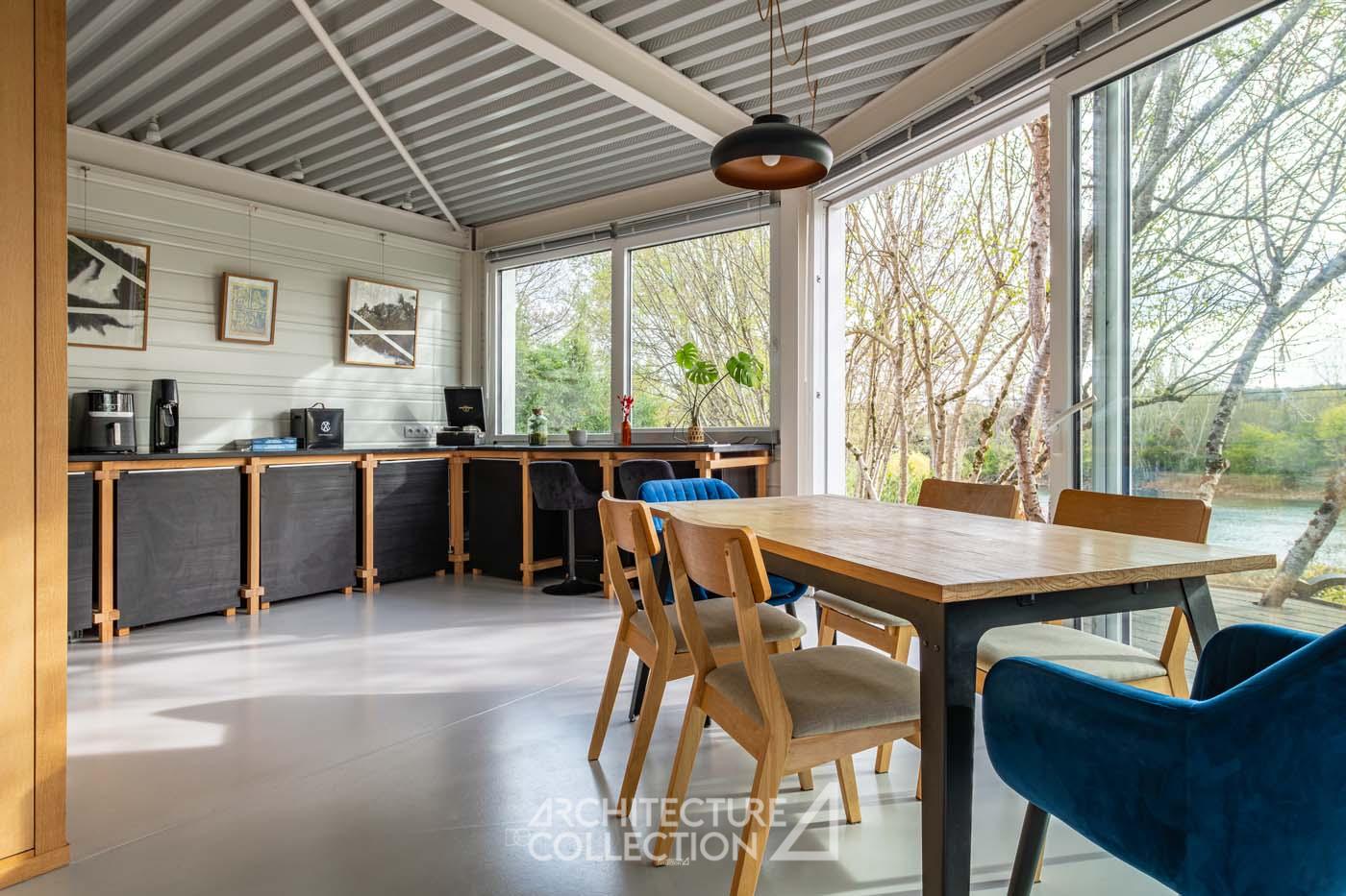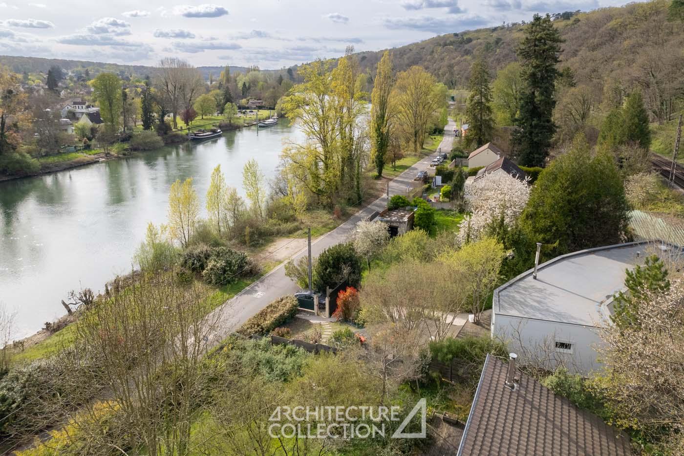 Perchée sur ses pilotis, cette maison de 115 m² prend place au sein d’un terrain paysager de 770 m² sur les bords de la Seine.