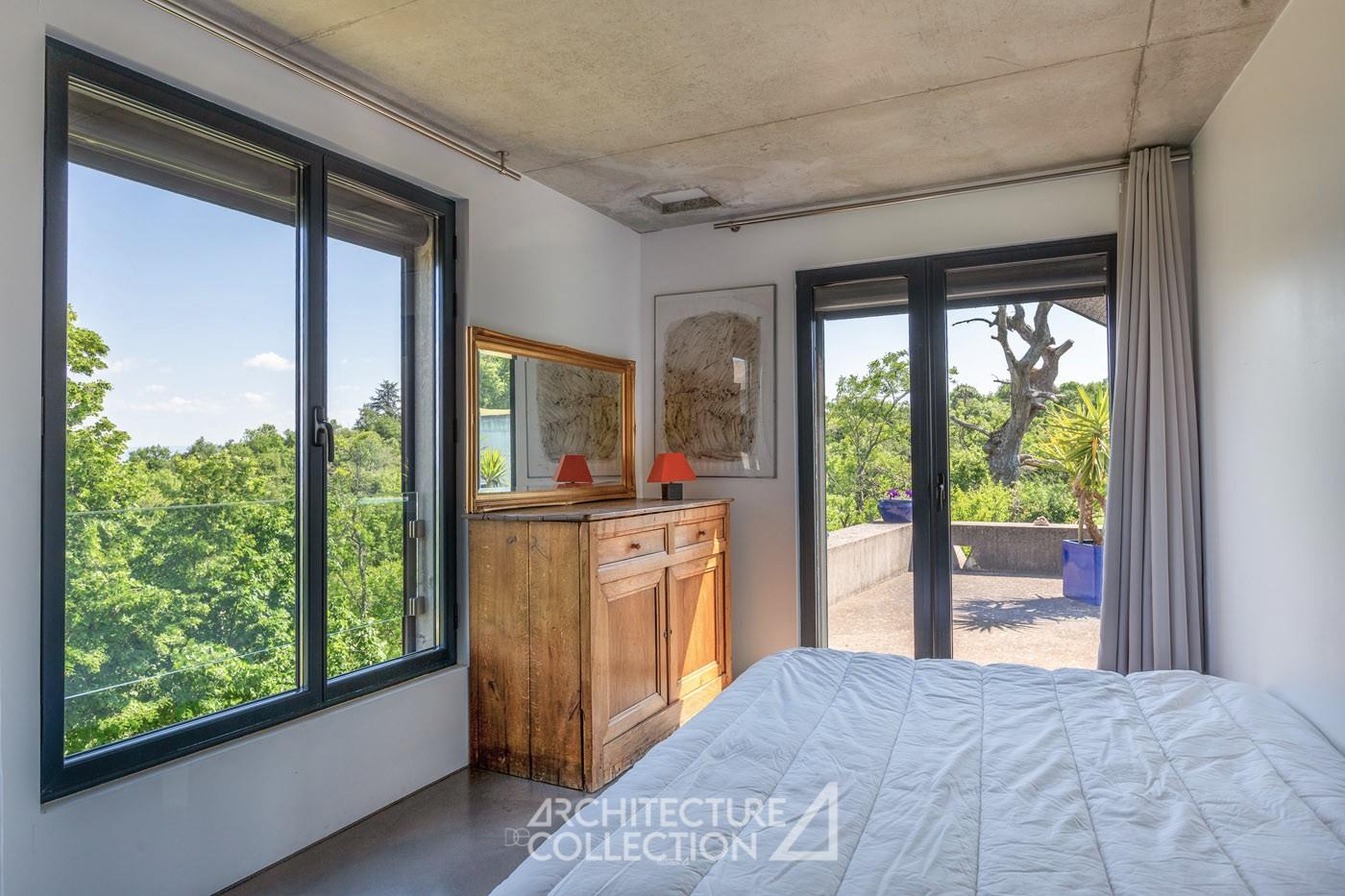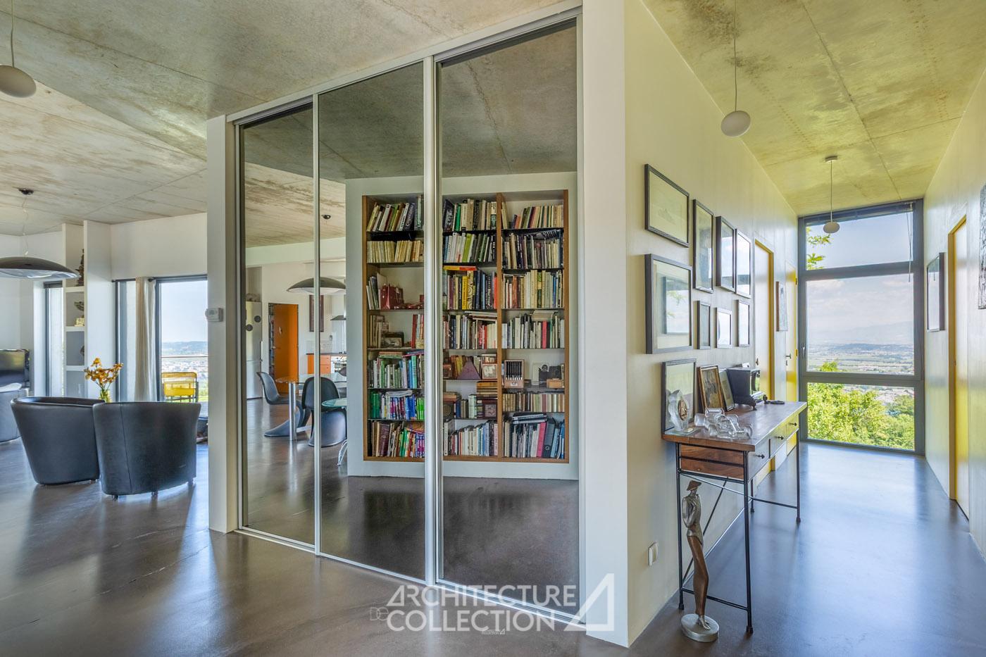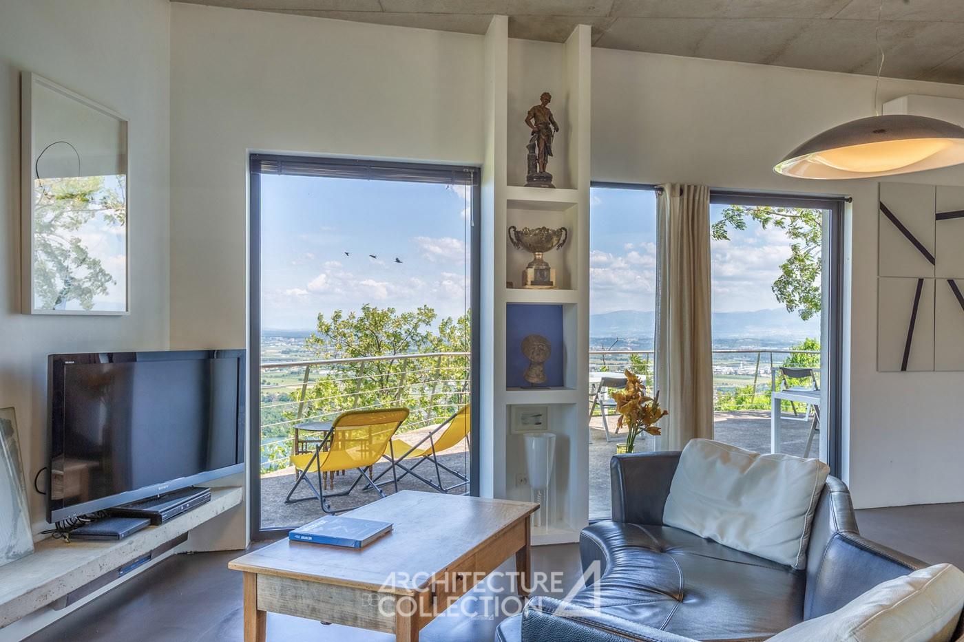 Réalisée par l’architecte Marie Adilon, cette maison de béton brut aux lignes graphiques a été construite en belvédère au-dessus de la vallée du Rhône, sur les fondations d’une ancienne bâtisse en pierre.