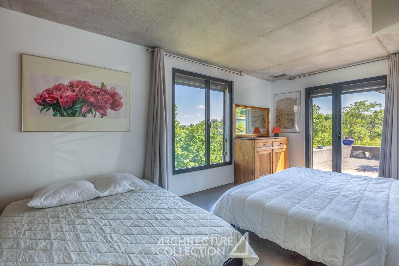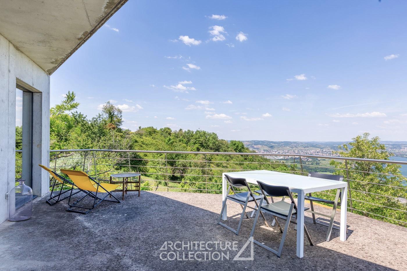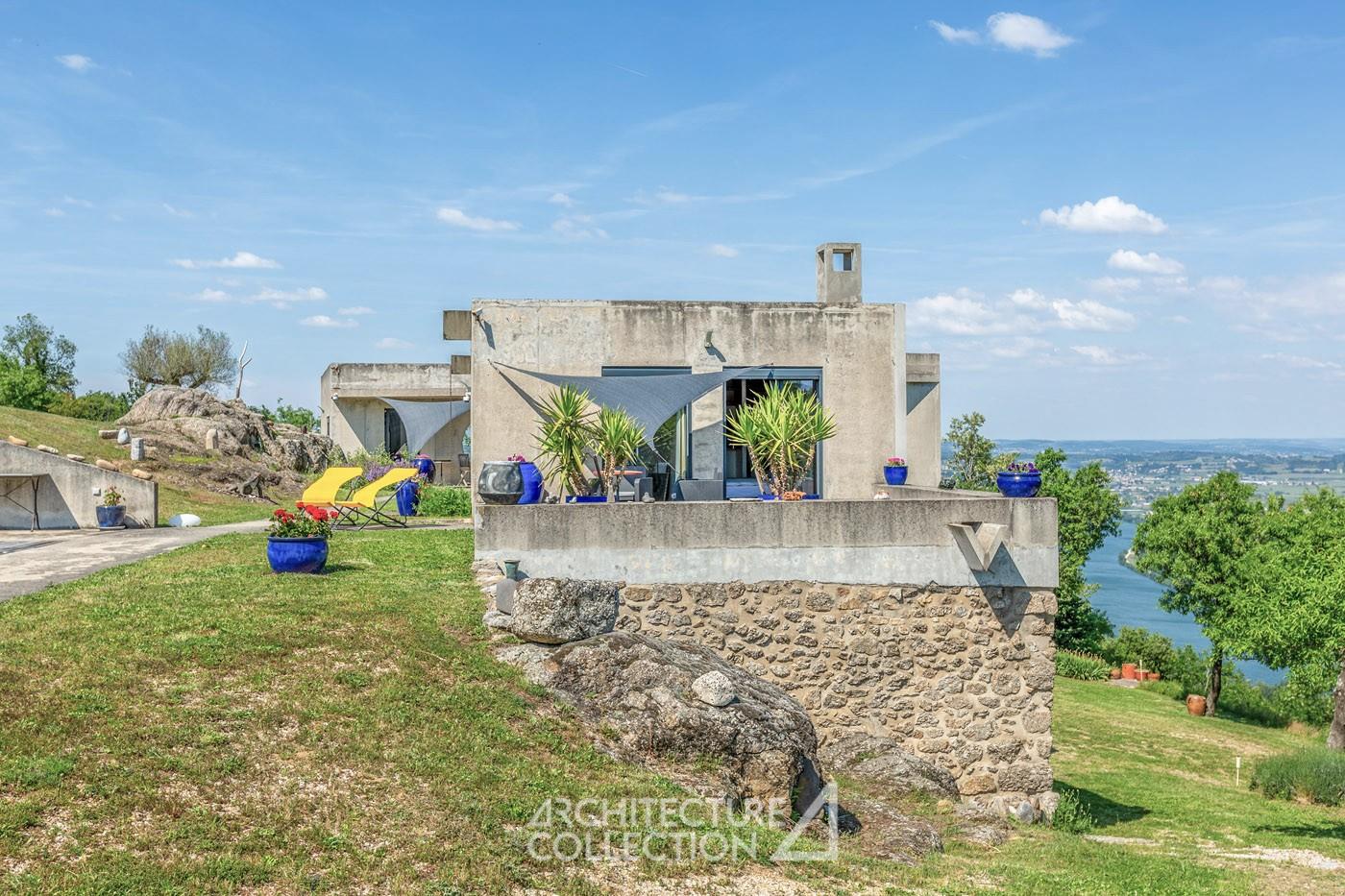 Réalisée par l’architecte Marie Adilon, cette maison de béton brut aux lignes graphiques a été construite en belvédère au-dessus de la vallée du Rhône, sur les fondations d’une ancienne bâtisse en pierre.