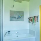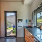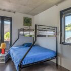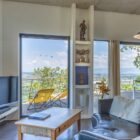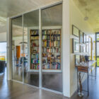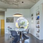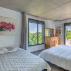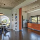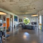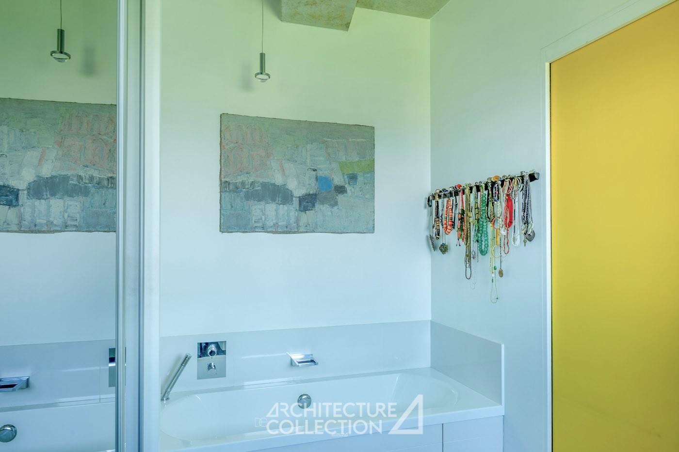 A l’intérieur, les lignes obliques du plan créent une sensation d’ouverture et d’espace. Dans chaque pièce, les parois épaisses sont doublées de tablettes, placards, étagères et niches intégrées à l’architecture, dans une démarche qui rappelle les différentes réalisations de l’architecte Georges Adilon. La sobriété de la palette de matériaux employée – béton ciré au sol, béton brut au plafond et sur les éléments structurels, mis en valeur par les aplats blancs lisses des murs – contraste avec quelques touches de couleurs franches. Cette approche minimaliste laisse la part belle au paysage, omniprésent au sein de chaque espace grâce aux nombreuses baies de formes variées qui cadrent le panorama.