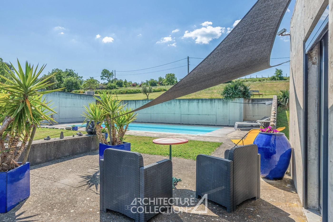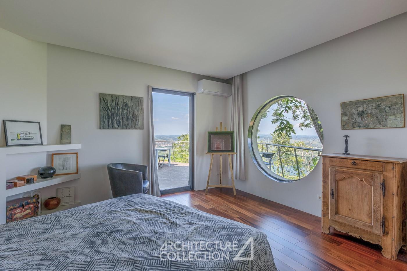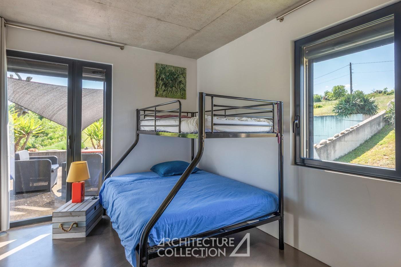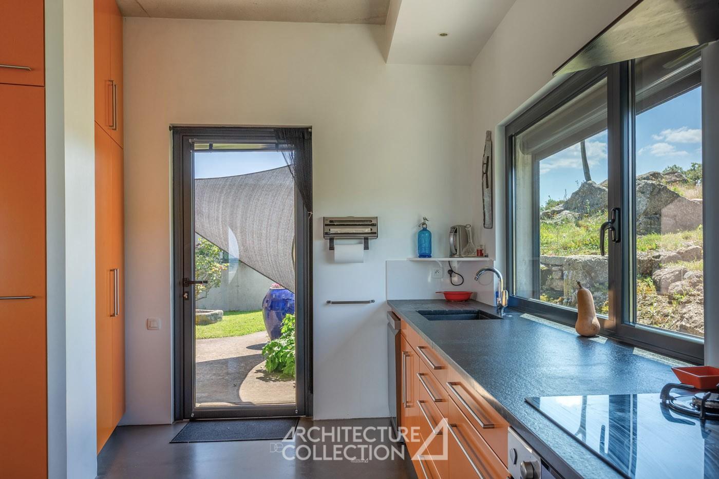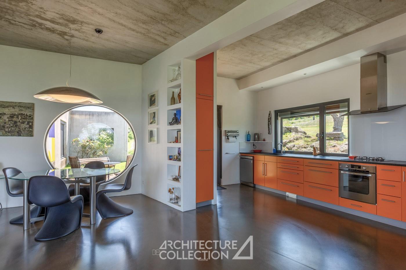 Issu de la surélévation d’un ancien corps de ferme en pierre, l’édifice déploie trois volumes prismatiques de béton armé, qui s’intègrent délicatement au terrain accidenté et au paysage grandiose. Les lignes brisées du béton laissé brut dialoguent avec la roche, la végétation de garrigue du lieu et la course du soleil, qui sculpte les volumes dans un constant jeu d’ombre et de lumière. Les façades au dessin minimaliste sont marquées par la composition géométrique libre des ouvertures, tantôt circulaires ou carrées, larges ou étroites. De sobres gargouilles de béton en forme de V et leur réceptacles de galets permettent de collecter les eaux pluviales acheminées vers une réserve à l’usage du jardin. Seul élément coloré de l’architecture, une plaque de grès émaillé, œuvre de Georges Adilon, orne l’entrée principale de la maison.