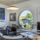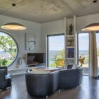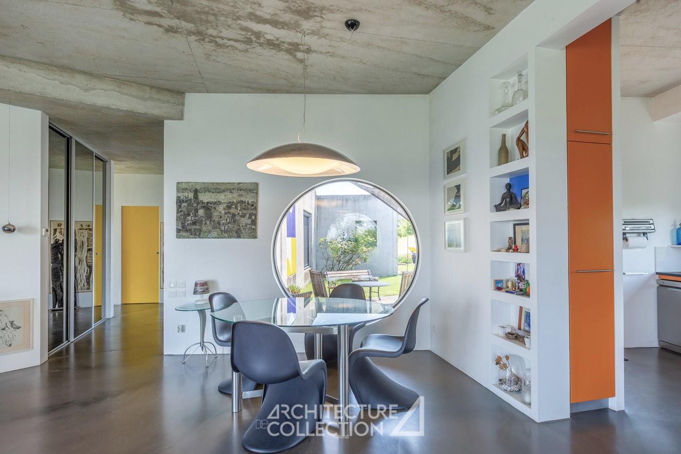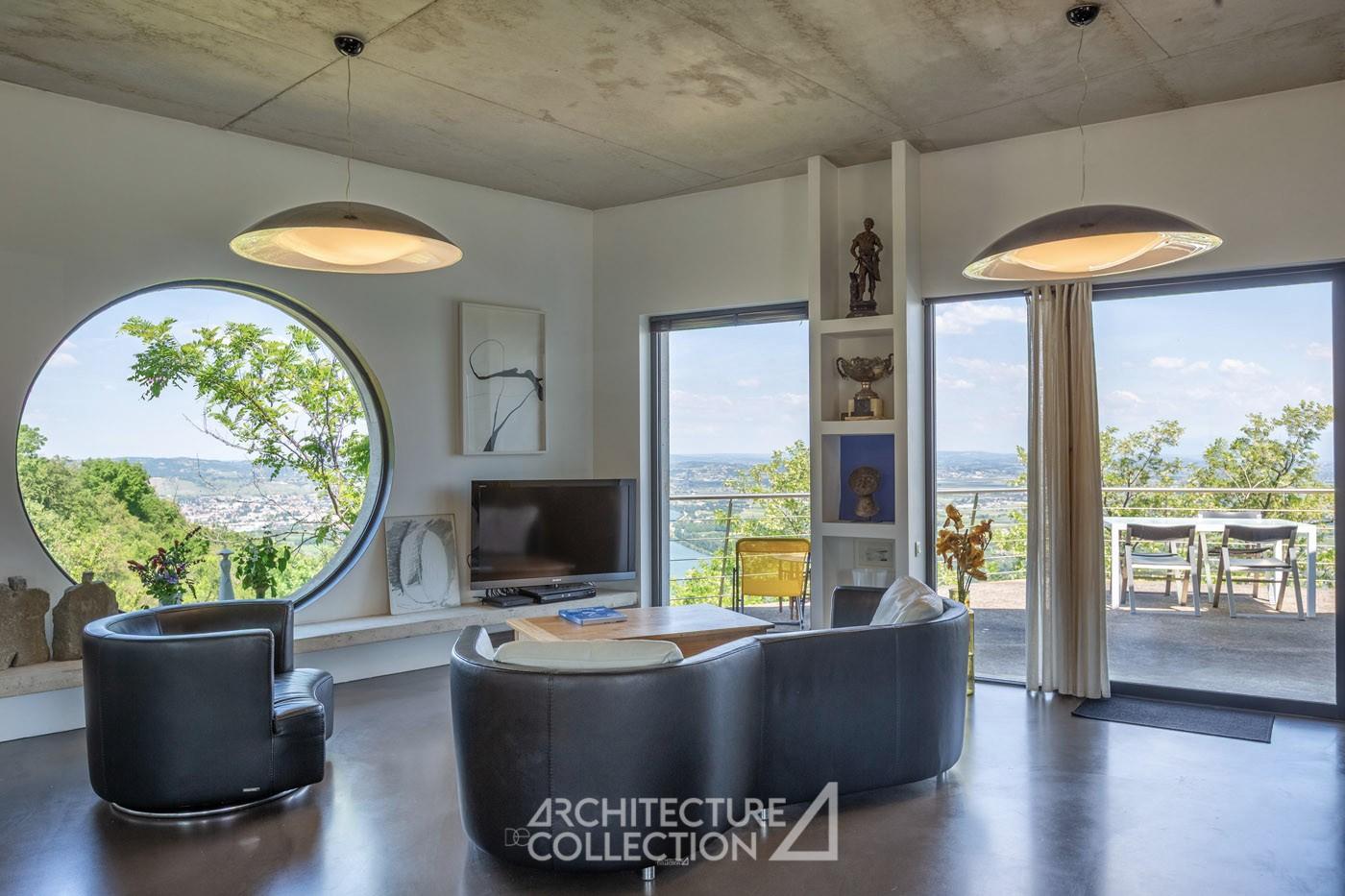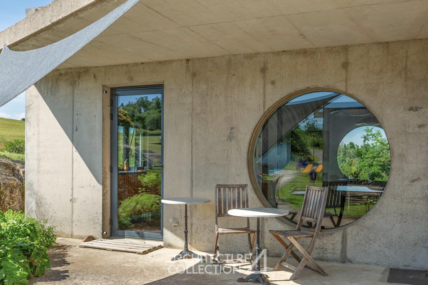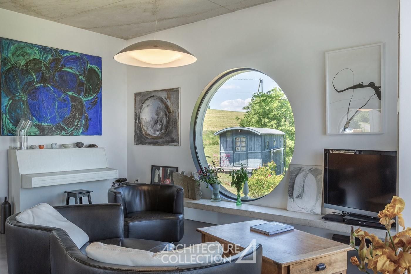 “ Quelque chose de la beauté du monde pénètre en permanence par les grandes baies vitrées circulaires ou carrées qui cadrent le paysage autrement, librement…”