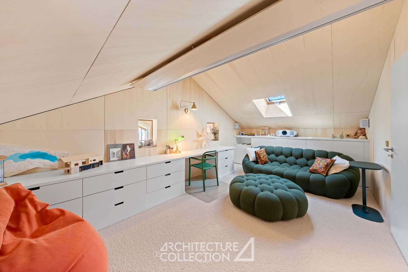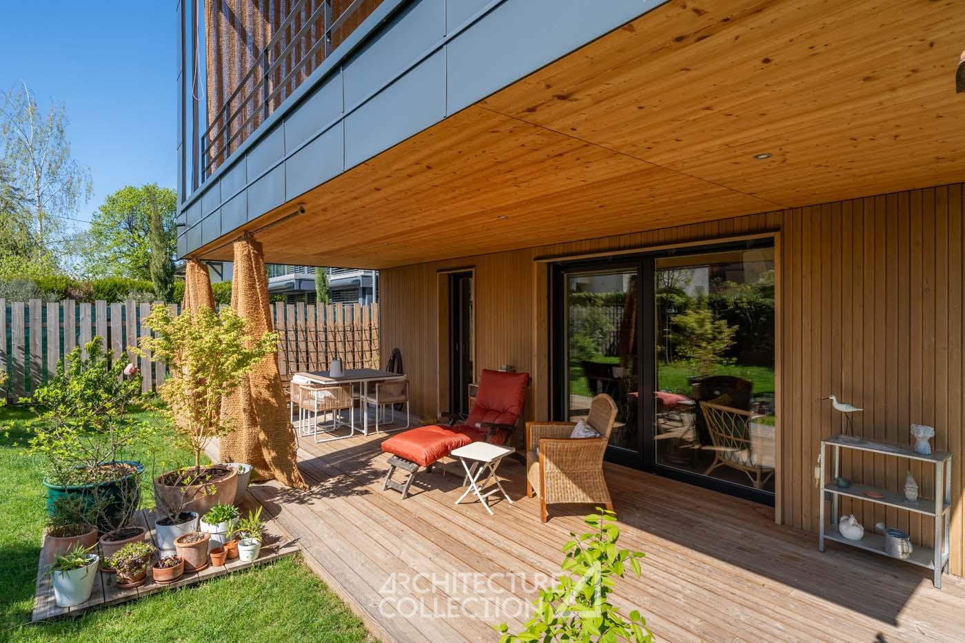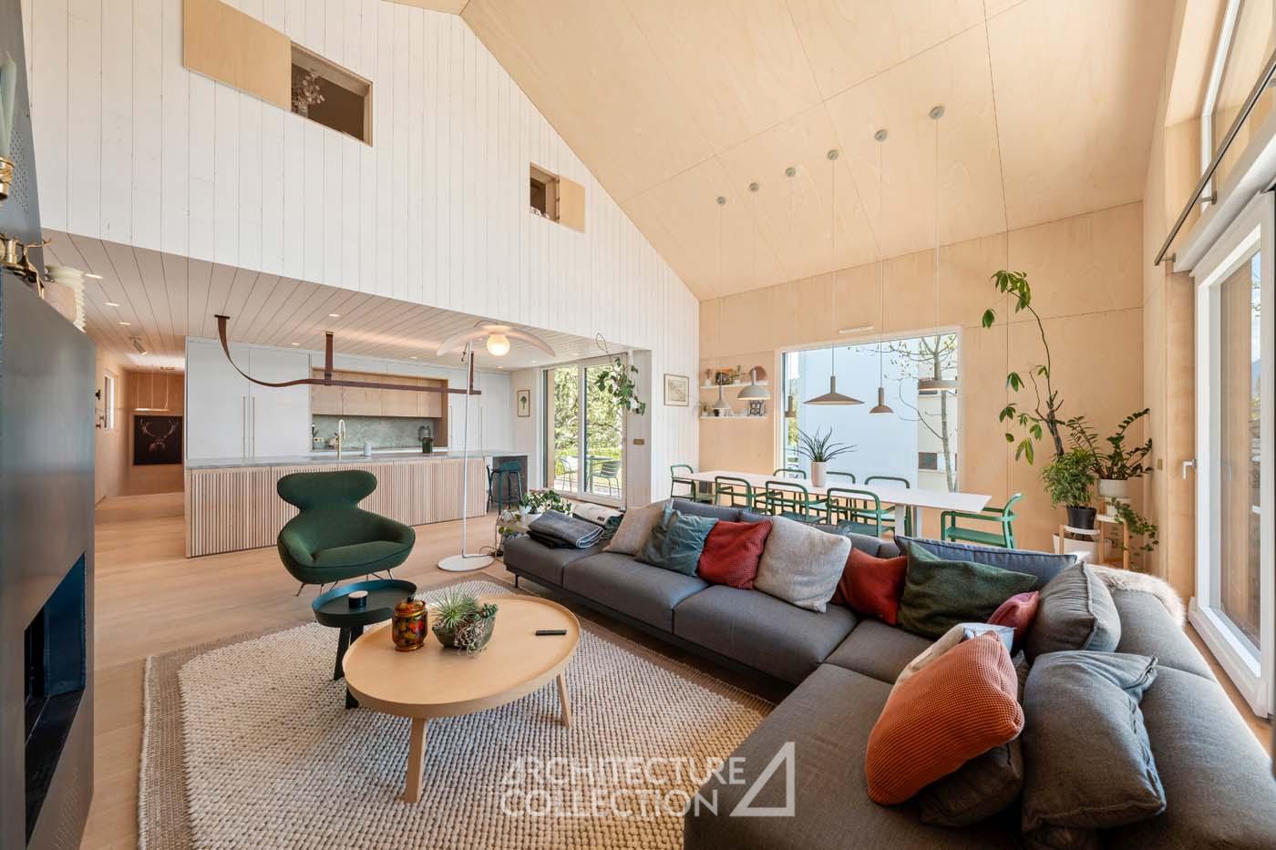 A proximité du Lac Léman en Haute-Savoie, cette maison réalisée en 2023 par un cabinet d’architectes local s’inspire des codes de l’architecture vernaculaire et offre un lieu de vie contemporain d’une grande qualité technique et environnementale.