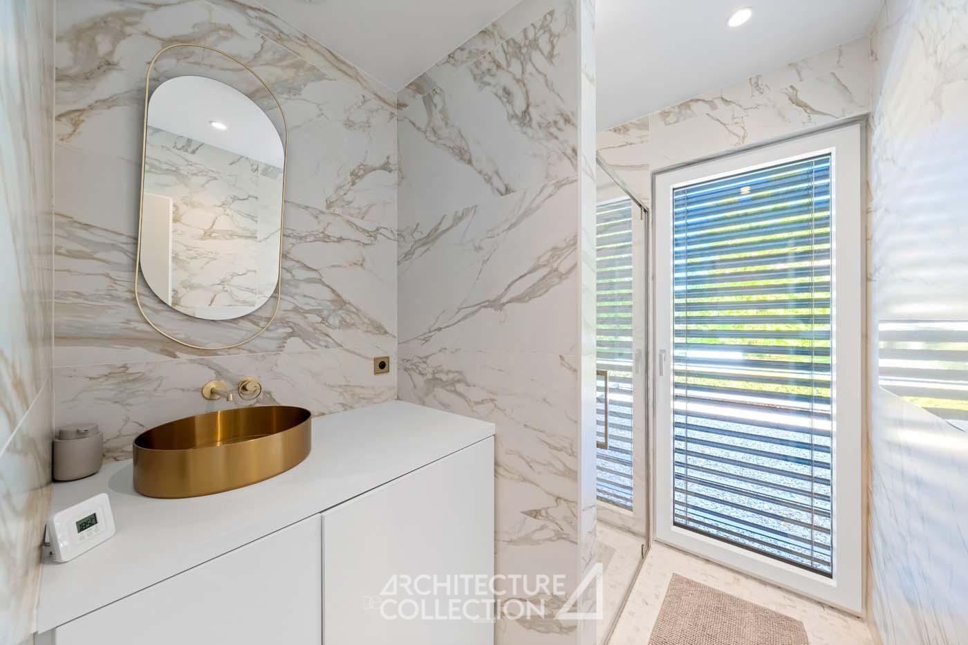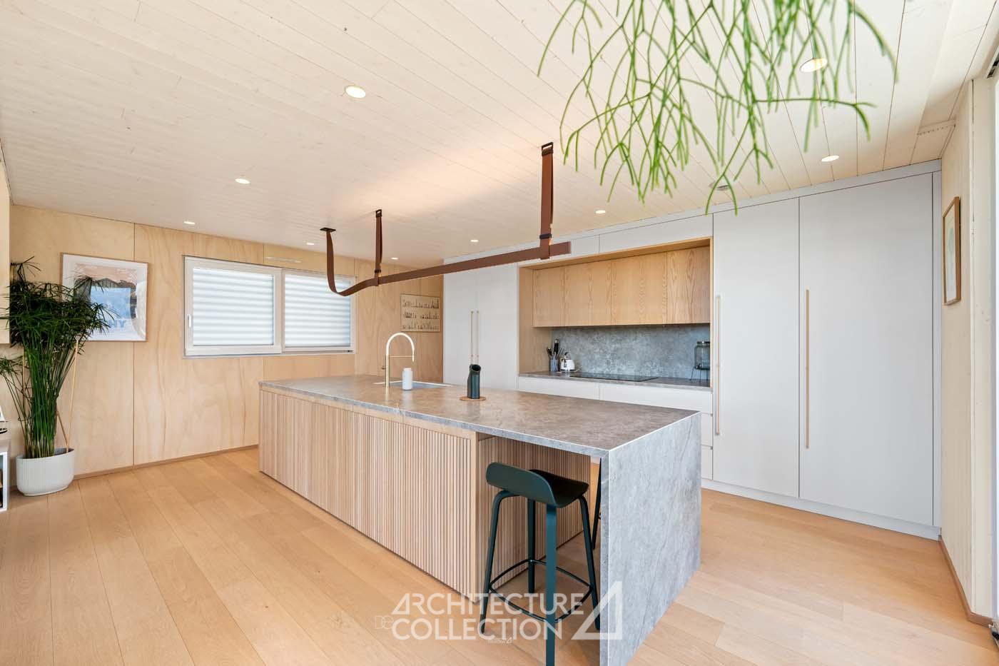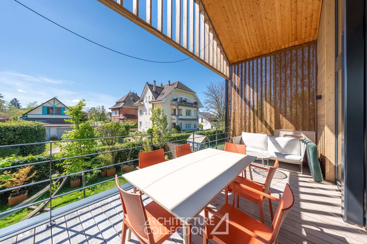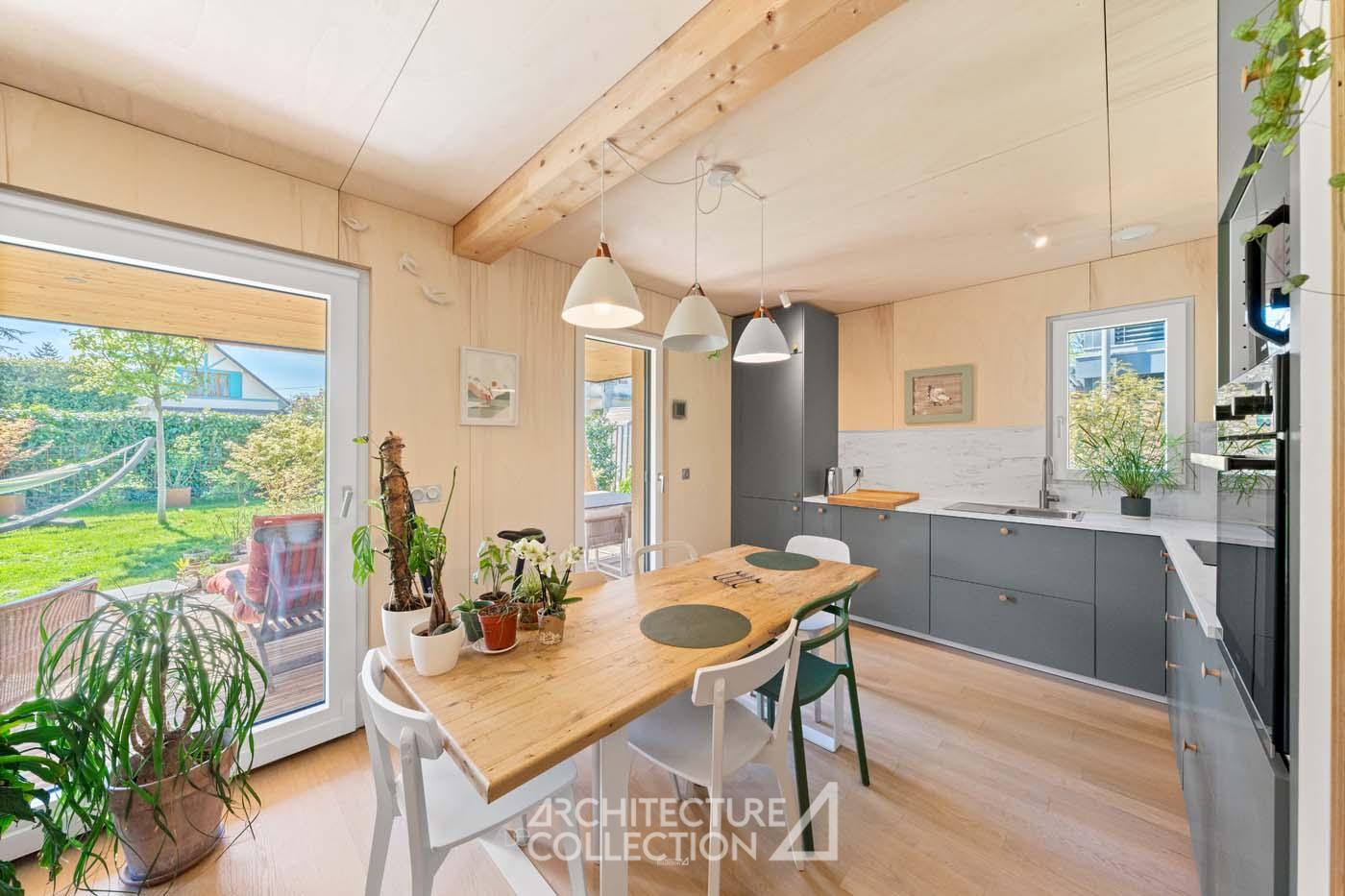 A proximité du Lac Léman en Haute-Savoie, cette maison réalisée en 2023 par un cabinet d’architectes local s’inspire des codes de l’architecture vernaculaire et offre un lieu de vie contemporain d’une grande qualité technique et environnementale.