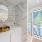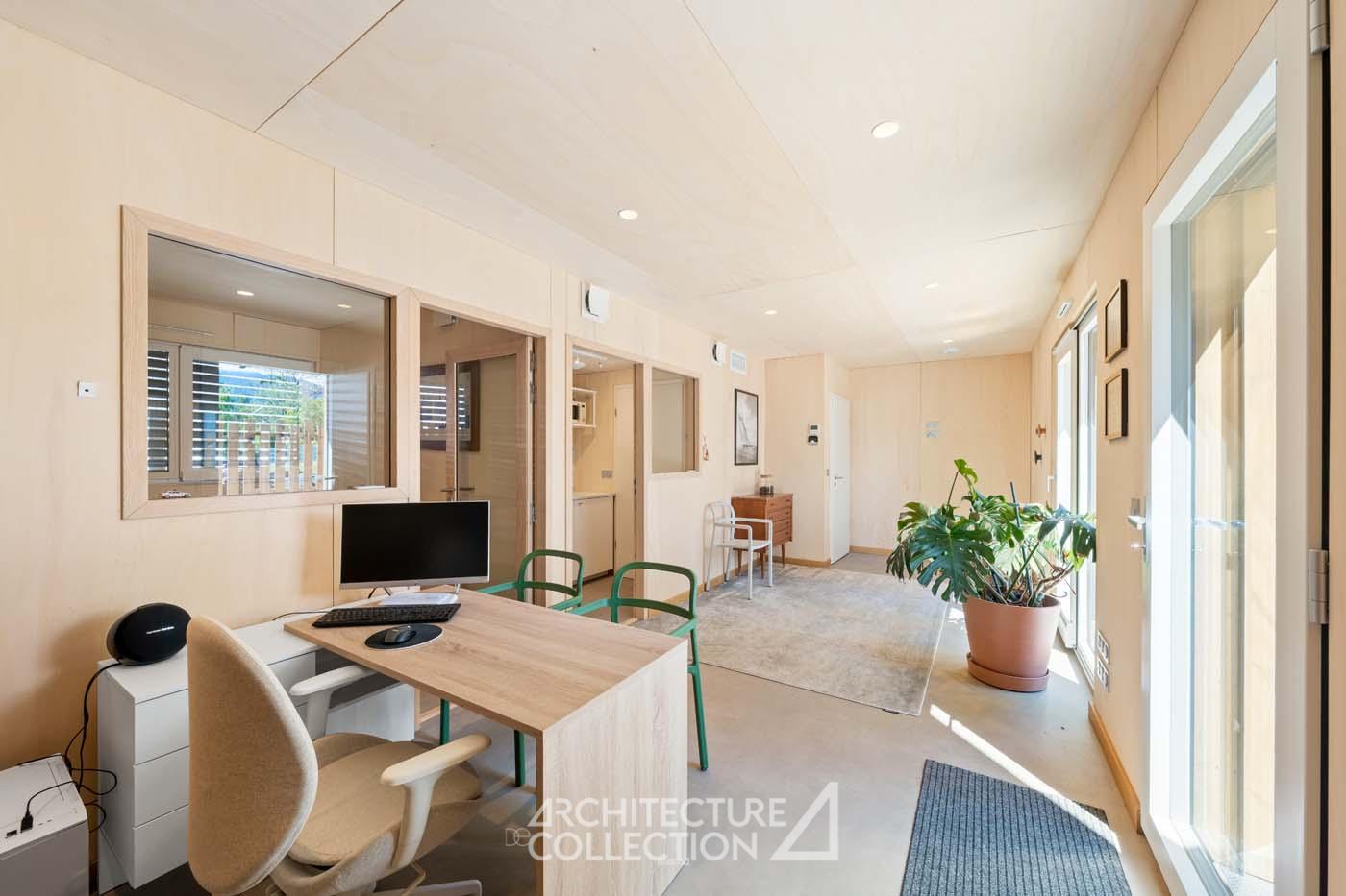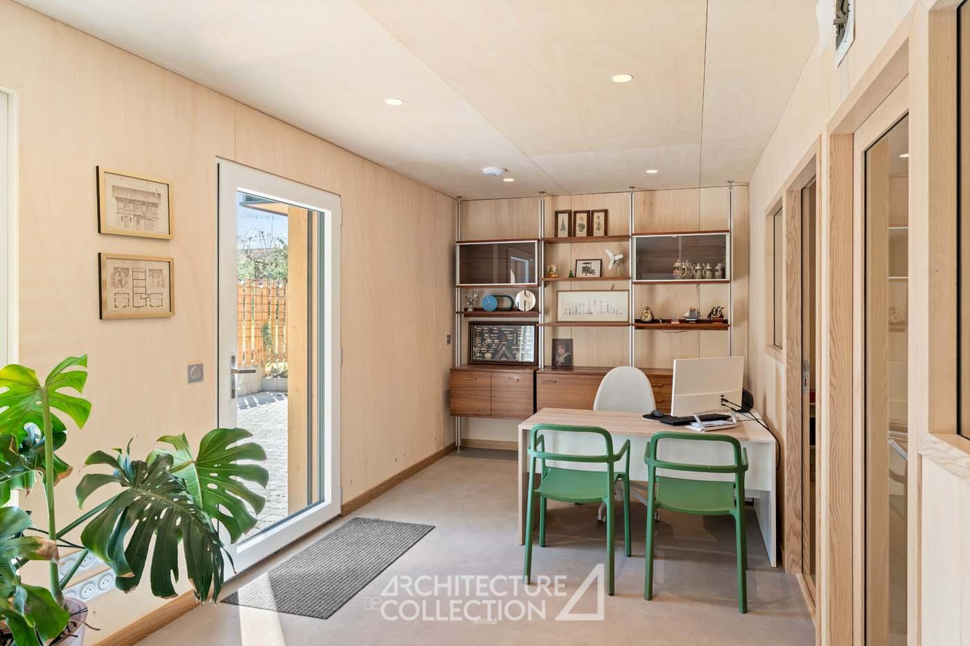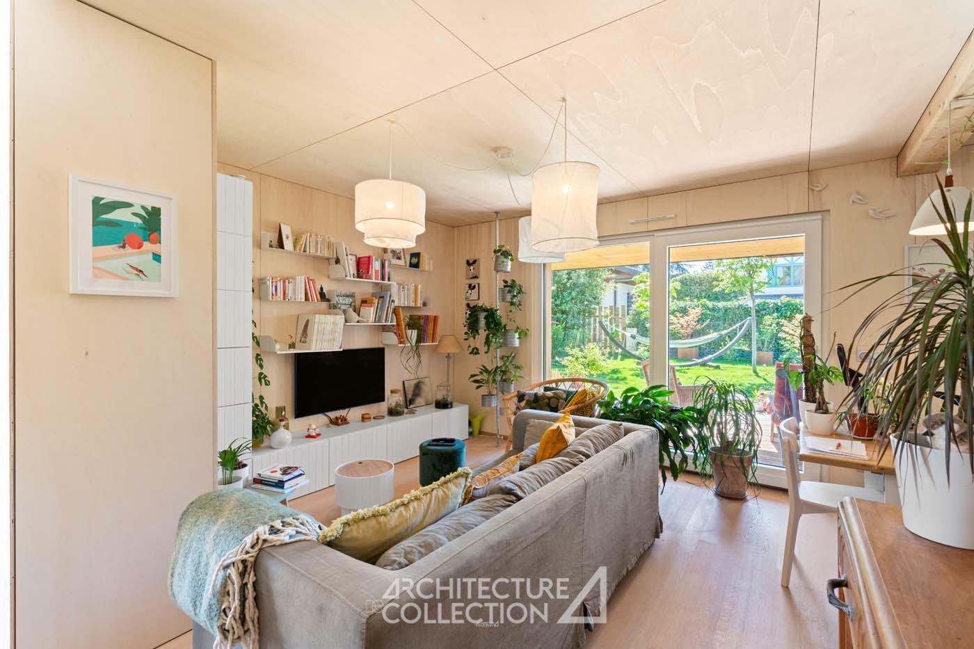 Au sein d’un jardin paysager de 230 m², l’habitation déploie une surface de 220 m² sur 3 niveaux et comprend 3 espaces indépendants.