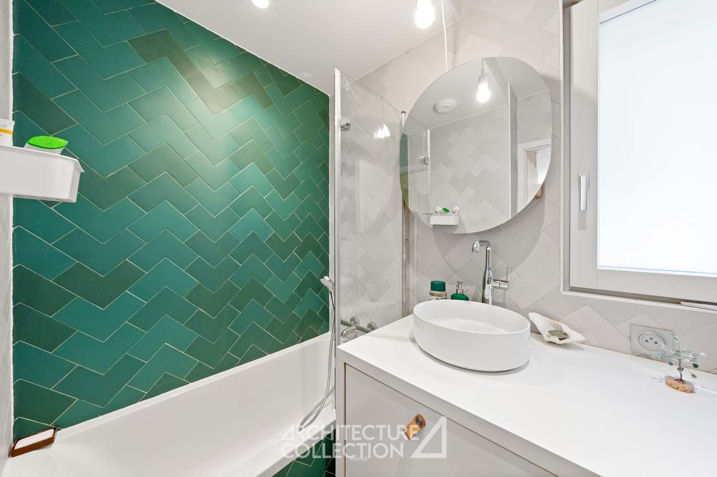 Le rez-de-jardin est divisé en deux dépendances. Donnant sur les exterieurs, un appartement d’environ 50 m² comprend un séjour lumineux avec une cuisine ouverte et équipée et un espace salle à manger, 2 chambres et une salle d’eau. L’ensemble profite d’une terrasse ombragée et d’un jardin.