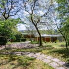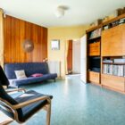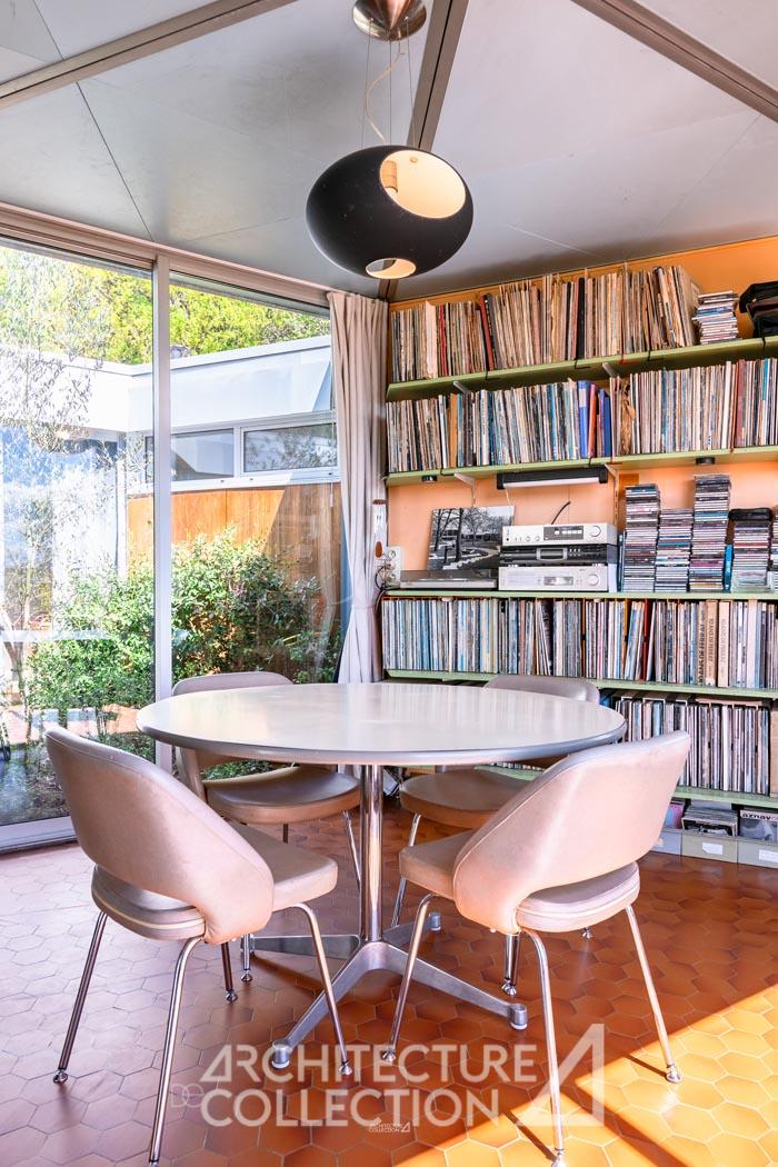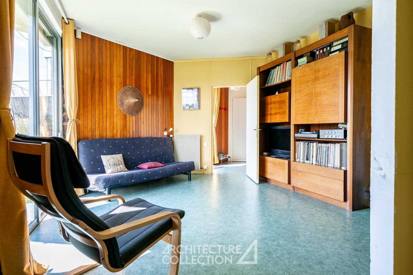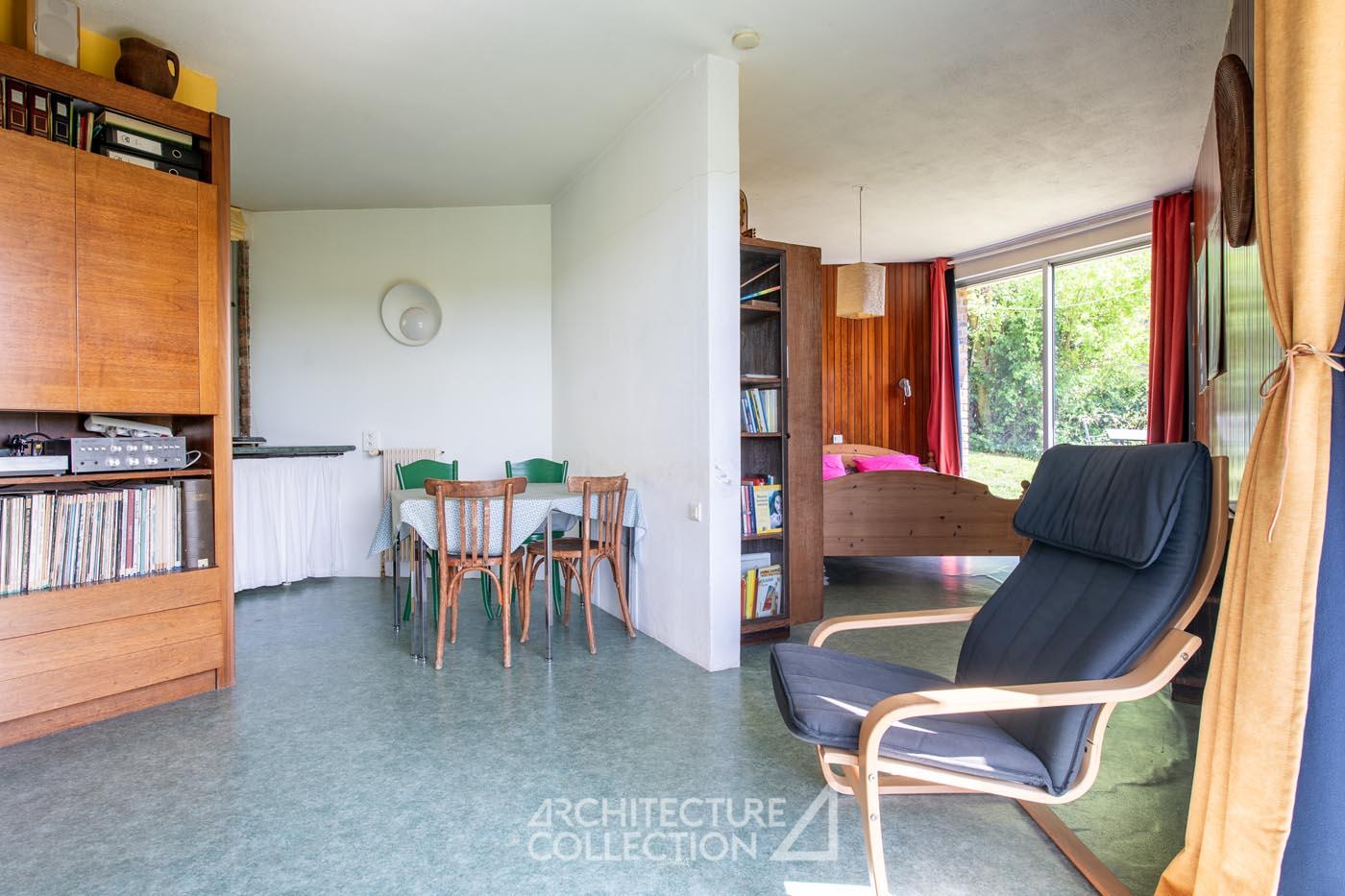 Conçue en 1972 par Claude Le Goas, cette résidence offre un précieux témoignage de sa pensée visionnaire sur l’architecture, alliant recherche morphologique, exploration formelle et réflexion approfondie sur les modes d’habitat. Reposant sur un soubassement en brique, la construction se distingue par l’utilisation du système GEEP-ALCO « trelement », ensemble d’éléments de construction standardisés et mis au point par l’entreprise allemande GEEP Industries.