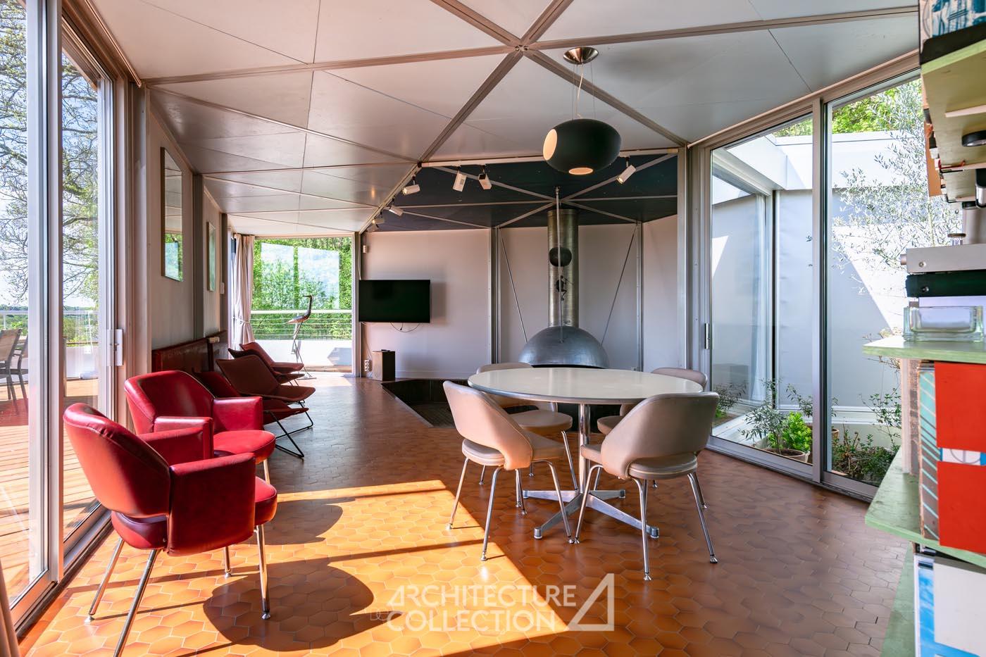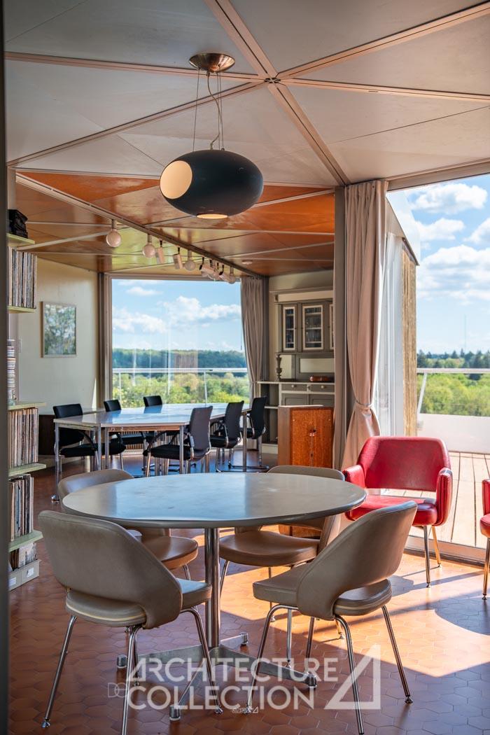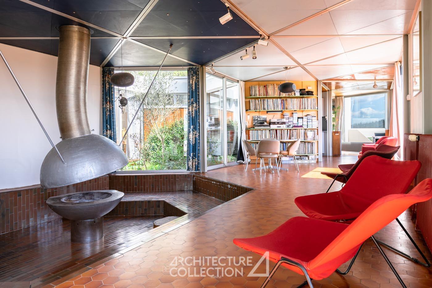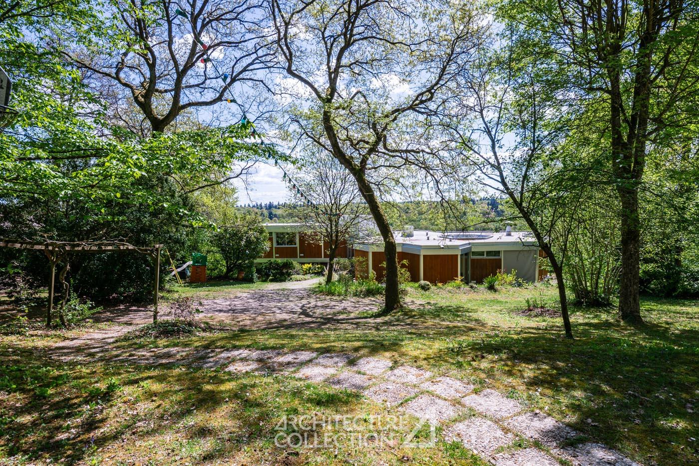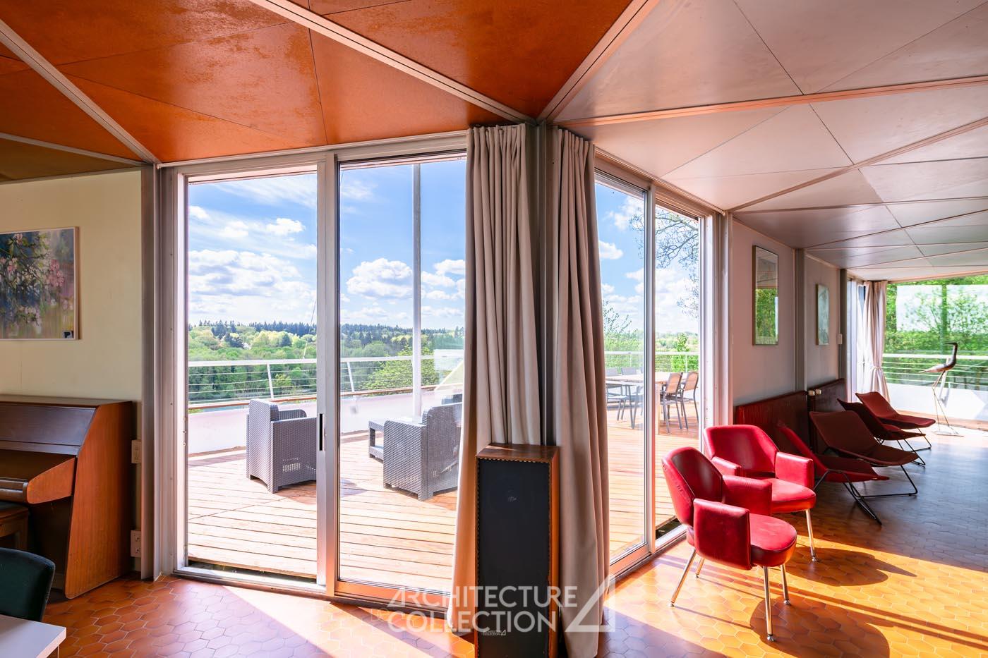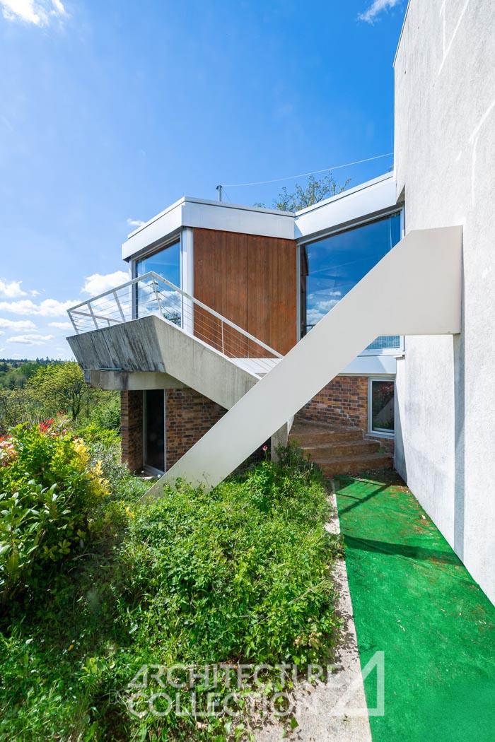 Signée par l’architecte Claude Le Goas en 1972, cette réalisation spectaculaire prend place sur un terrain de près d’un hectare, au cœur d’un site naturel classé sur les coteaux de Seine.