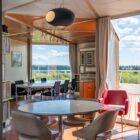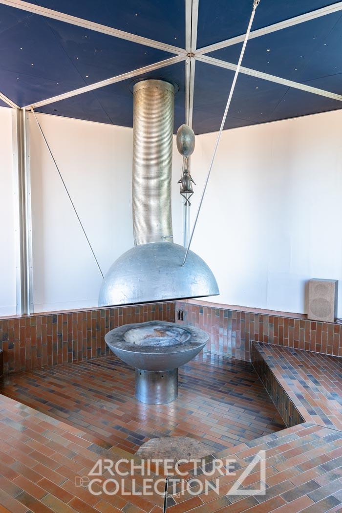 Le niveau principal comprend une entrée, une salle à manger et un salon de conversation. Ceui-ci, typique des années 1950 à 1970 et notamment du courant Mid-Century, est agrémenté d’une cheminée sculpturale. Cette partie réception de 64 m² est prolongée par une terrasse de 57 m² orientée sud.