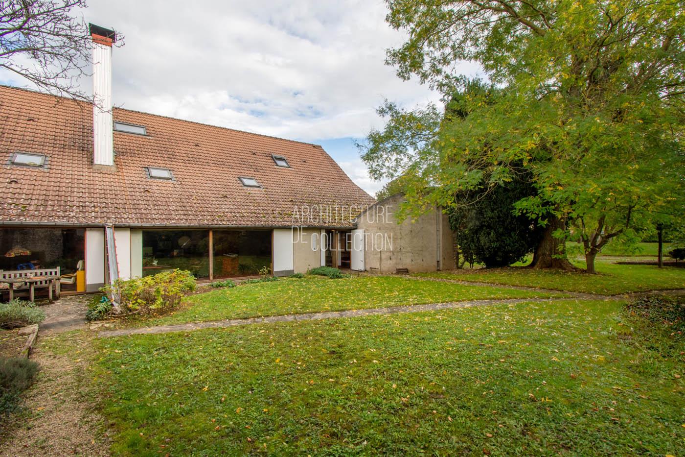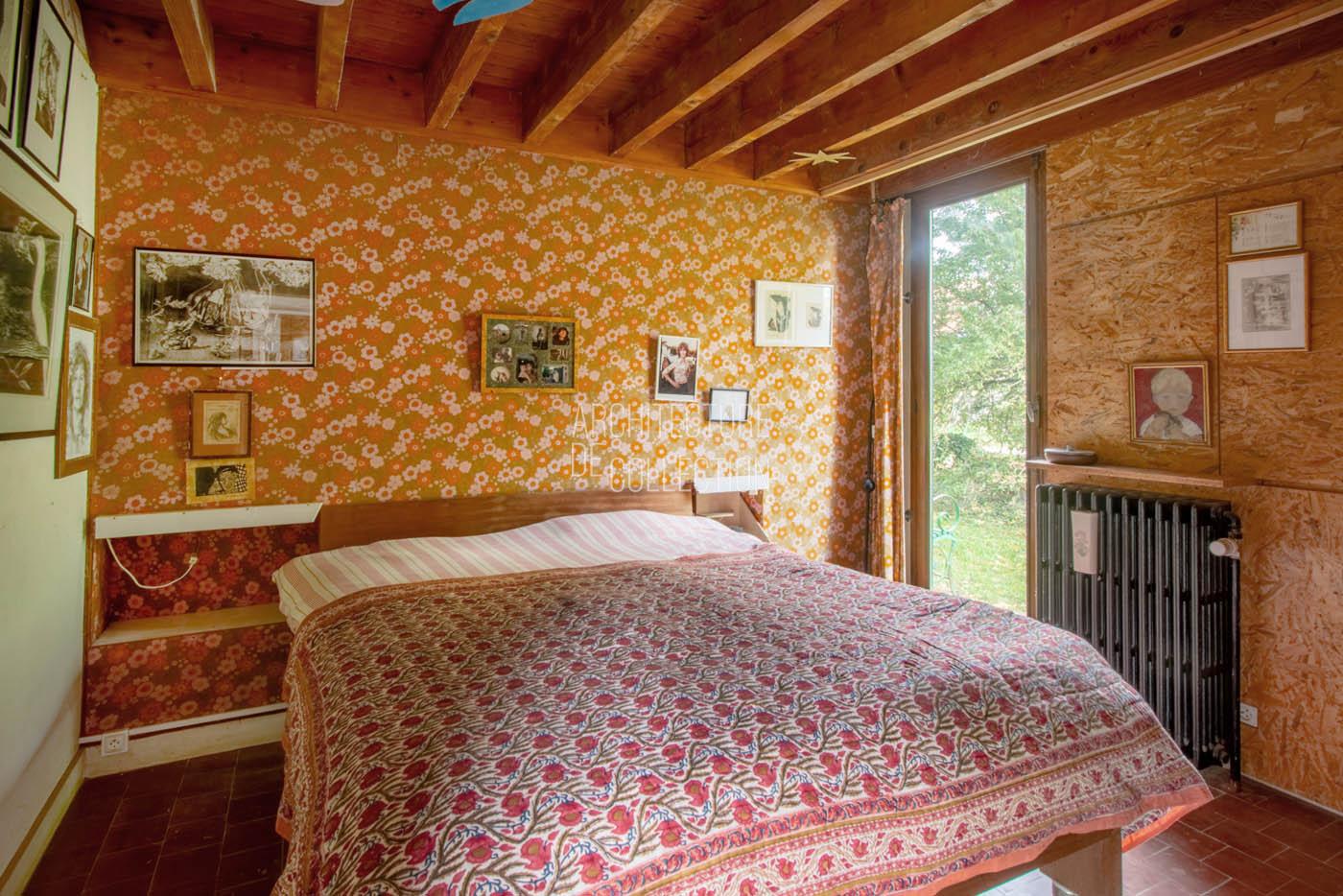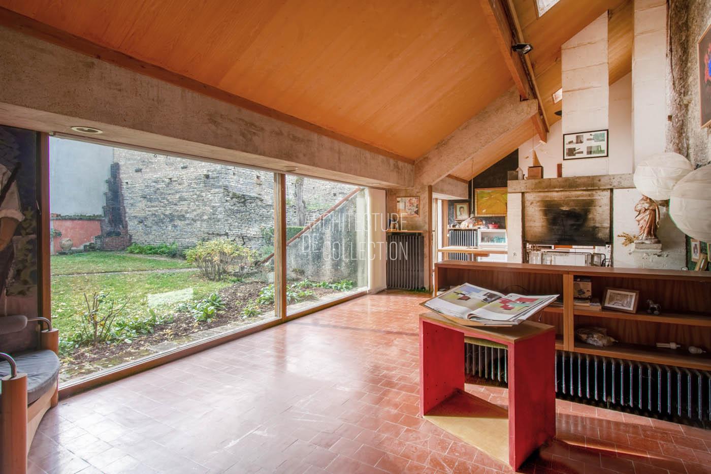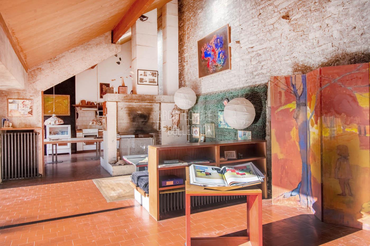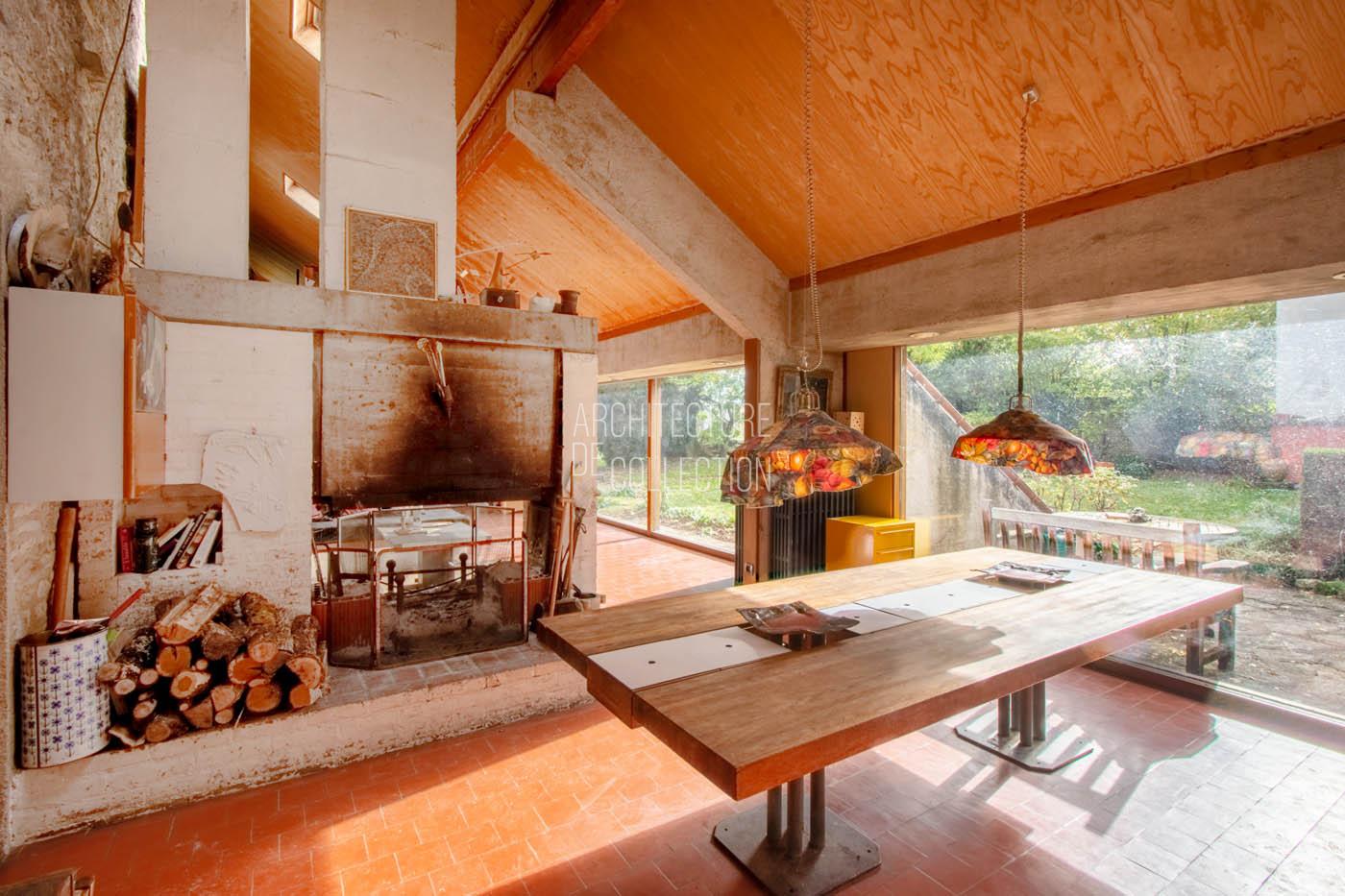 Le rez-de-chaussée, aménagé dans l’appentis, accueille un séjour entièrement ouvert sur le jardin grâce à une paroi de verre, un coin cheminée délimité par des banquettes maçonnées et une incrustation de parquet, une cuisine-salle à manger, un vaste espace atelier, 3 chambres et une salle de bain. Une réserve / cellier avec cave à vin, un local technique, une chaufferie et un garage complètent ce niveau.