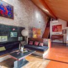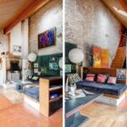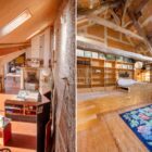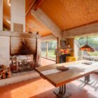 Les espaces de vie présentent une atmosphère chaleureuse invitant au partage, où la modernité s’exprime dans les matériaux bruts laissés apparents et la fluidité des volumes. Les poutres et piliers de béton brut de décoffrage côtoient les placages de bois au veinage naturel du plafond incliné, la pierre de pays des murs de l’ancienne grange et les tomettes de terre cuite rouge qui habillent le sol. Les chambres sont exposées à l’est pour capter le lever du soleil et les combles ont conservé leur impressionnante charpente en bois d’origine. Des ouvertures zénithales percées dans la toiture laissent entrer la lumière naturelle.