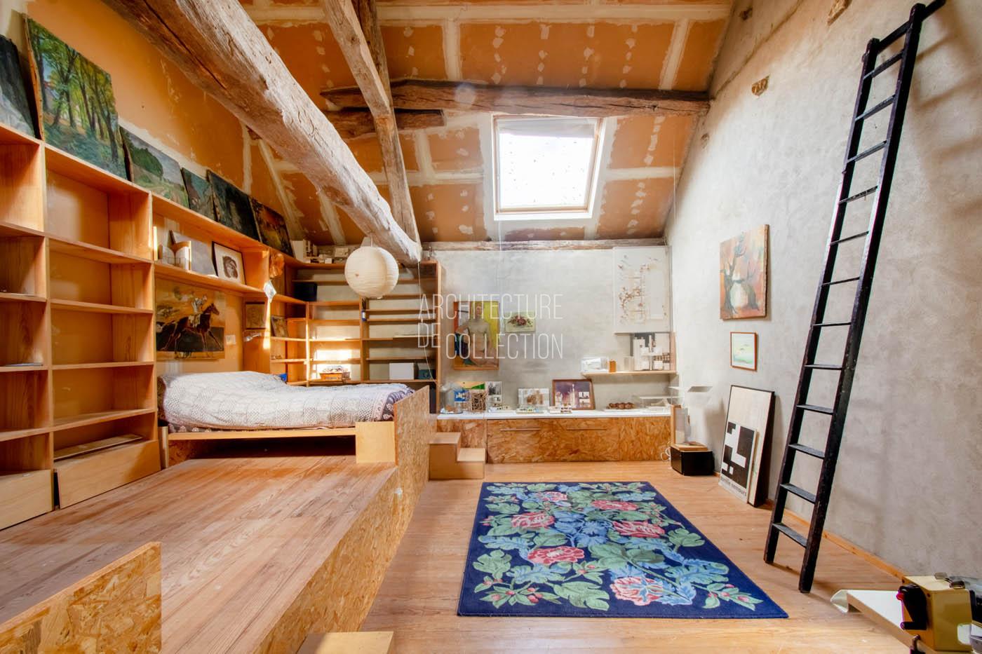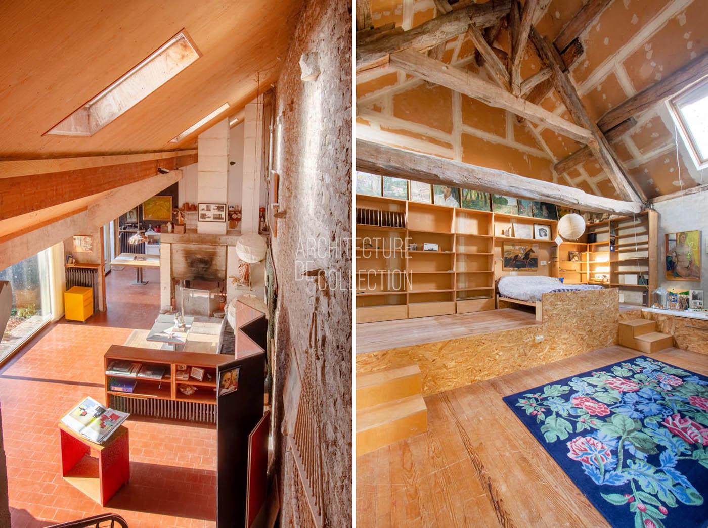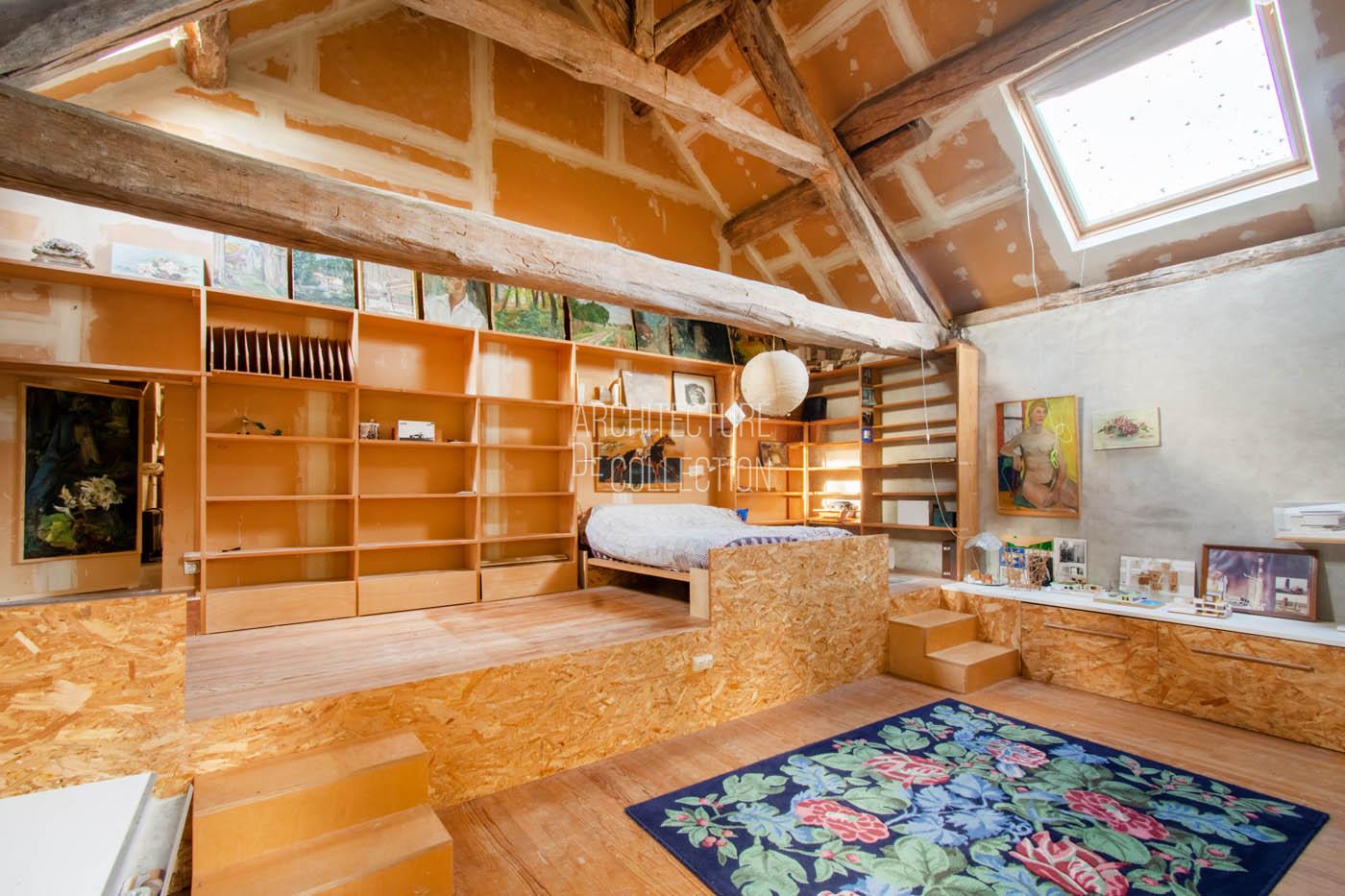 Les combles offrent un grand volume atelier, aménagé avec un coin chambre surélevé et une bibliothèque. Une seconde salle de bain était envisagée au rez-de-chaussée (projet disponible).