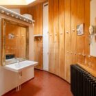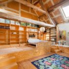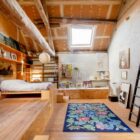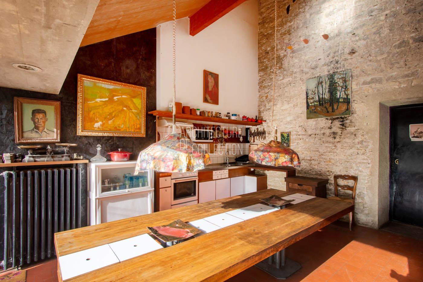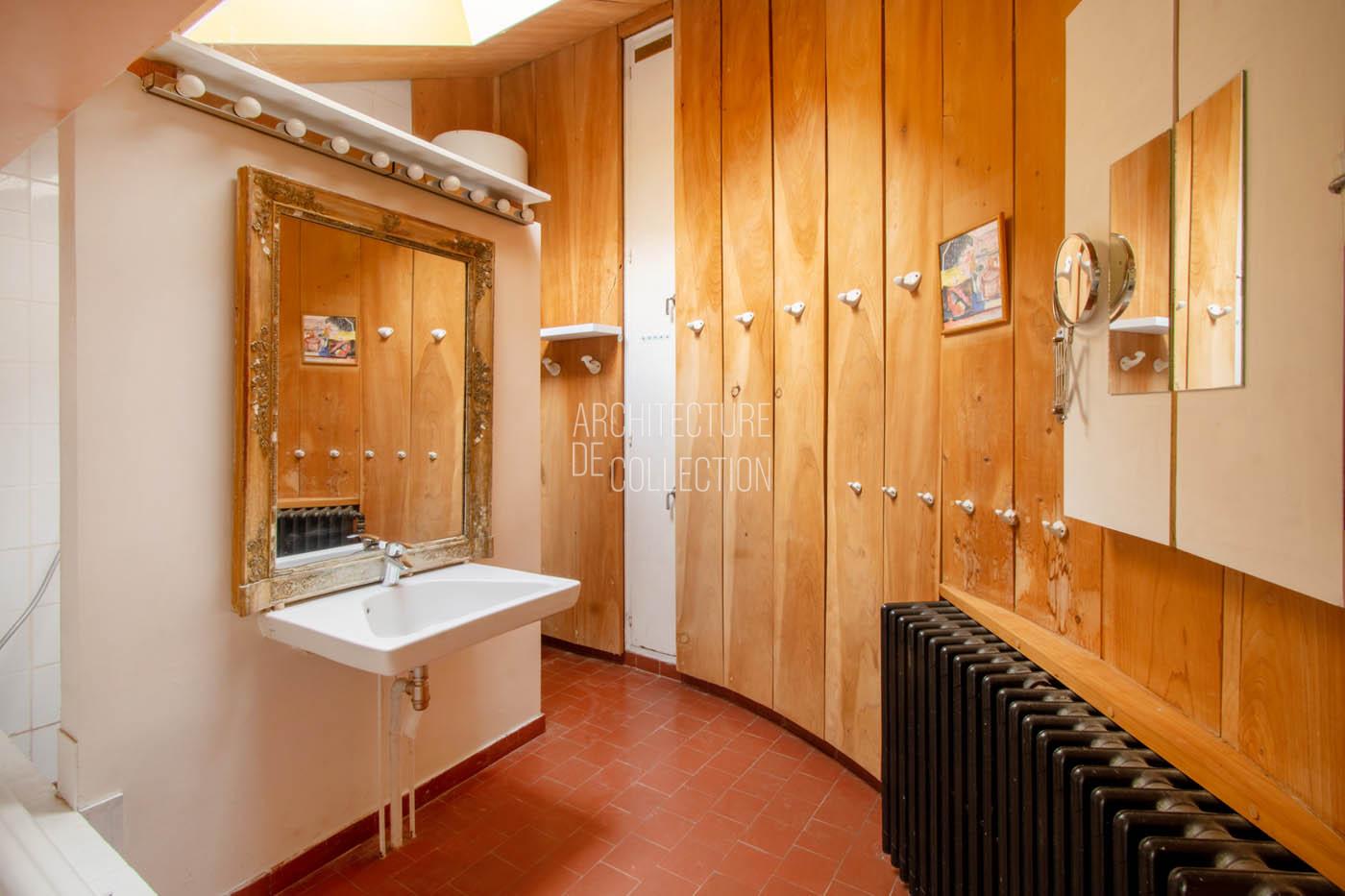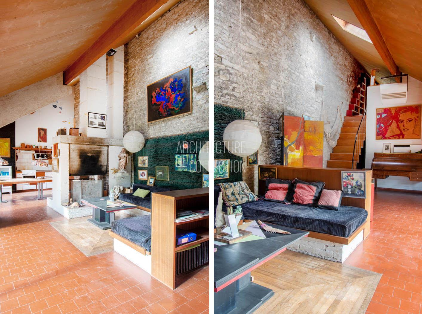 Les combles offrent un grand volume atelier, aménagé avec un coin chambre surélevé et une bibliothèque. Une seconde salle de bain était envisagée au rez-de-chaussée (projet disponible).