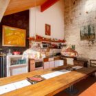 L’atelier aménagé dans la grange, pavé de pierre, offre un espace calme et propice à la création.