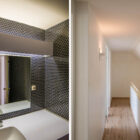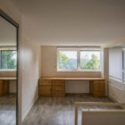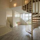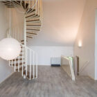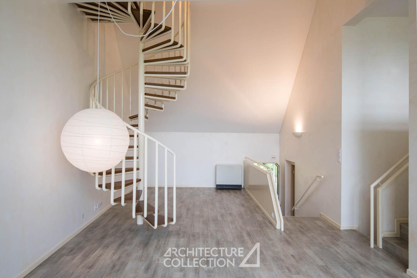 Le niveau supérieur, desservi par un escalier hélicoïdal en bois et métal au design typique des années 1970, comprend l’espace nuit, composé de trois chambres avec rangements et une salle d’eau.