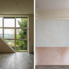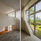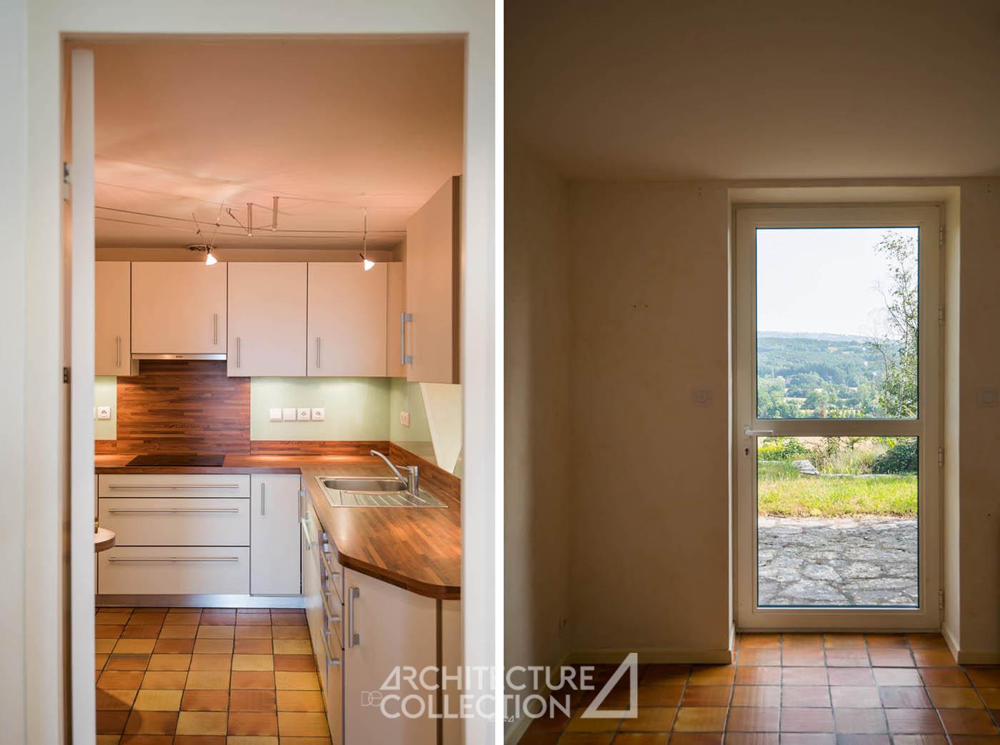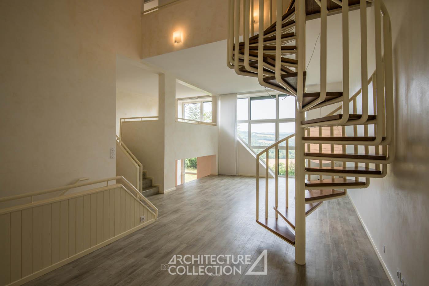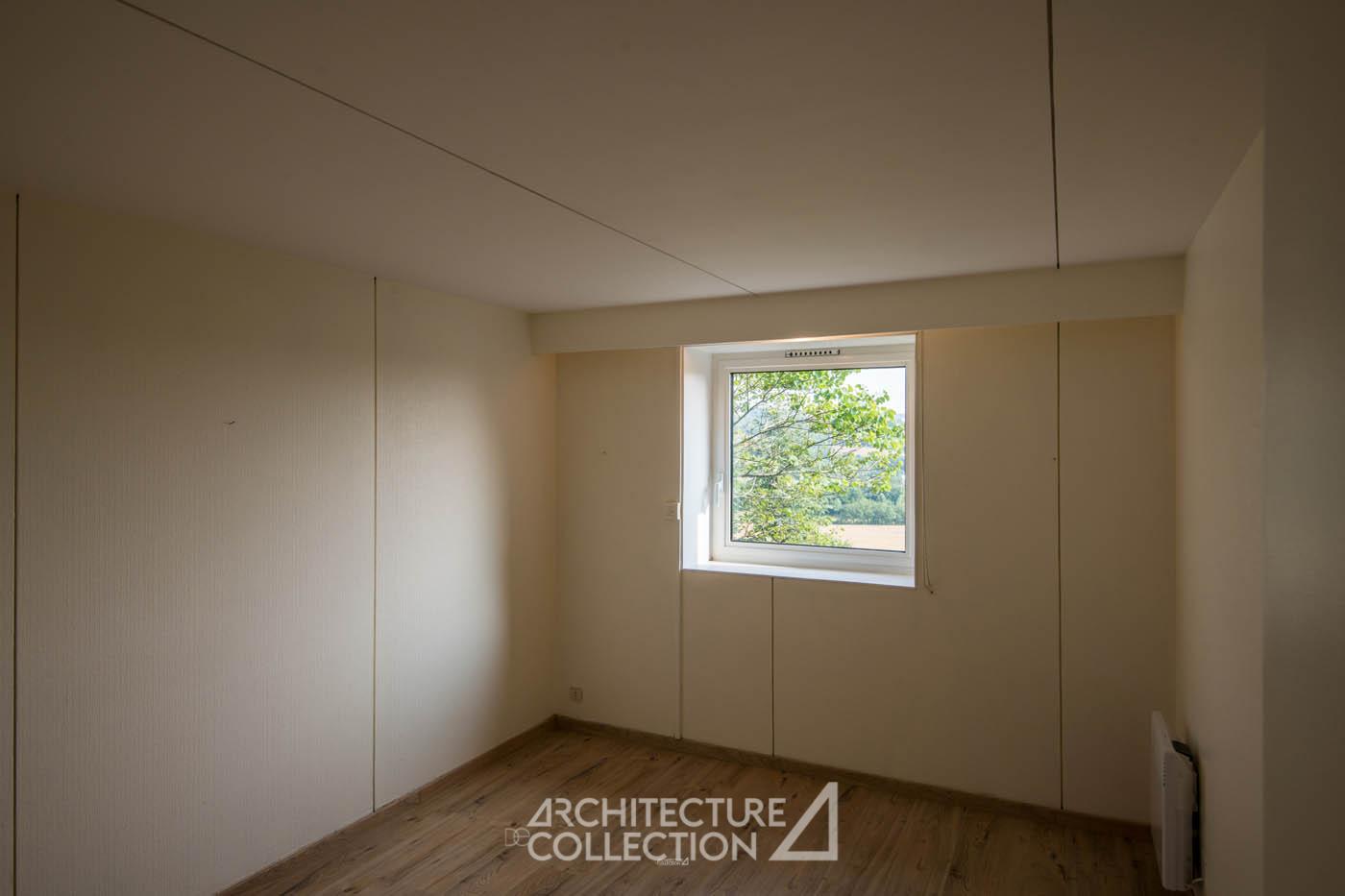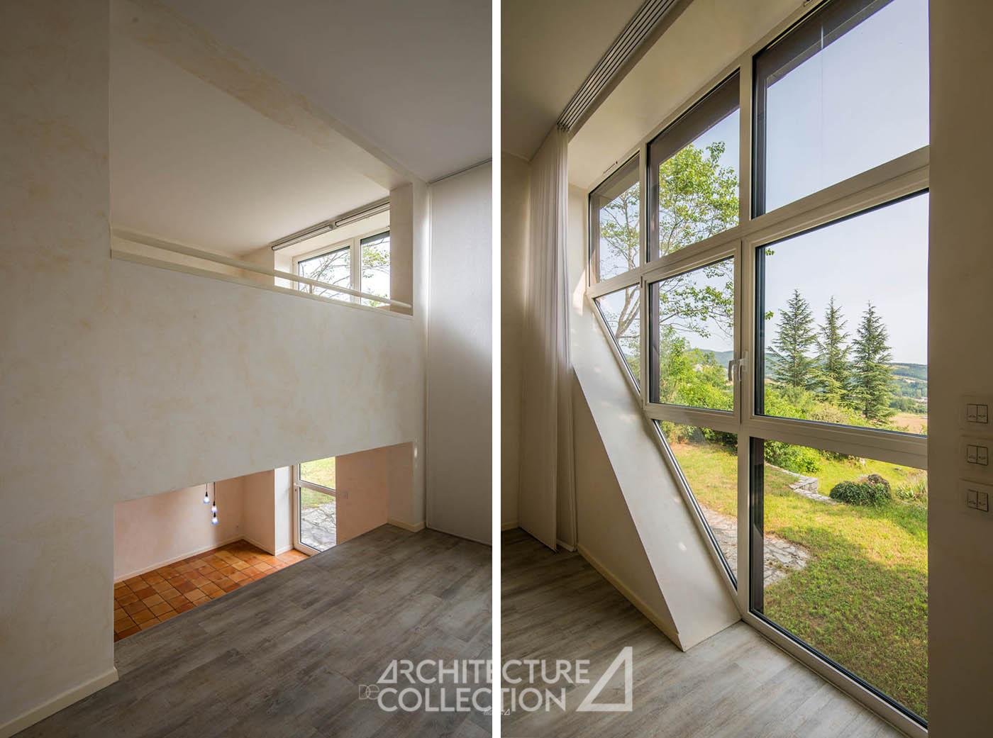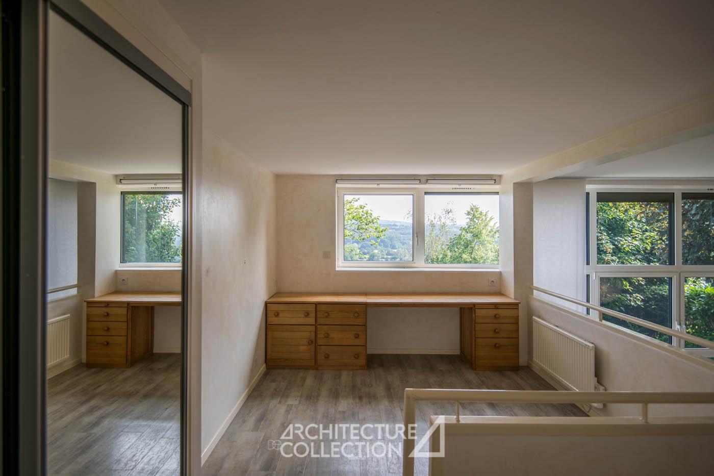 L’espace de vie s’organise sur deux demi-niveaux et accueille une cuisine et une salle à manger ouverte sur une terrasse panoramique orientée plein sud, offrant une perspective dégagée sur le paysage. Quelques marches plus haut, un salon en double hauteur est inondé de lumière grâce à d’immenses baies vitrées géométriques donnant sur le massif forestier des Palanges. Cet espace est complété d’un bureau (ou chambre) en mezzanine et d’une salle d’eau.