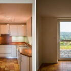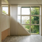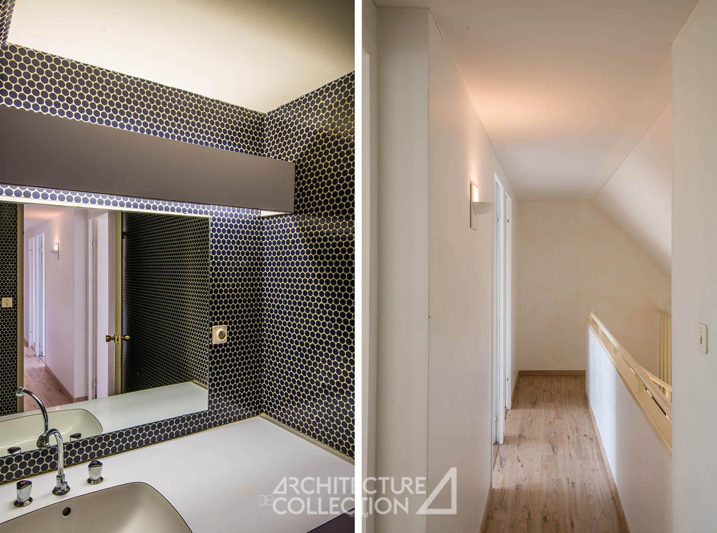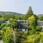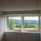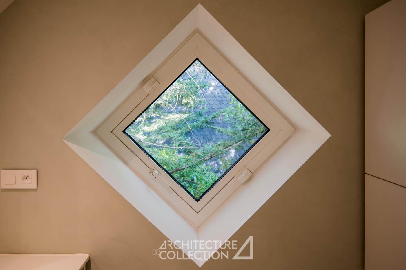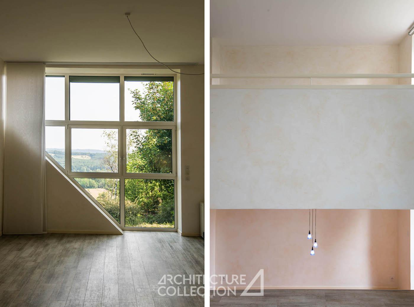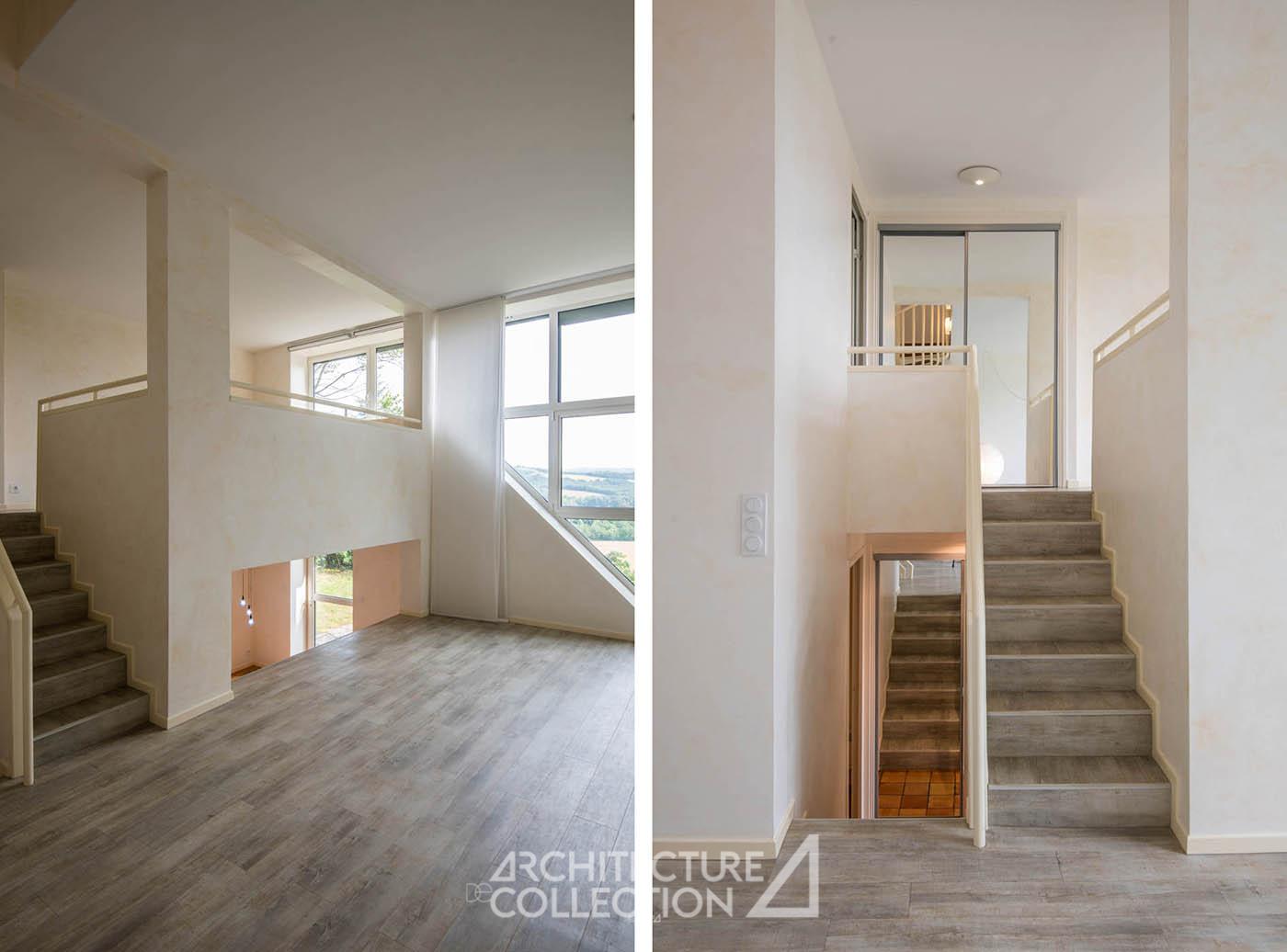 Les différents espaces, étagés en demi-niveaux, communiquent entre eux par de nombreuses percées visuelles qui apportent une grande légèreté à l’ensemble et créent des circulations fluides et aérées. Les nombreuses ouvertures cadrées sur le panorama et l’horizon plongent les espaces de vie dans la nature environnante. La pente du toit crée des espaces plus intimes à l’étage.