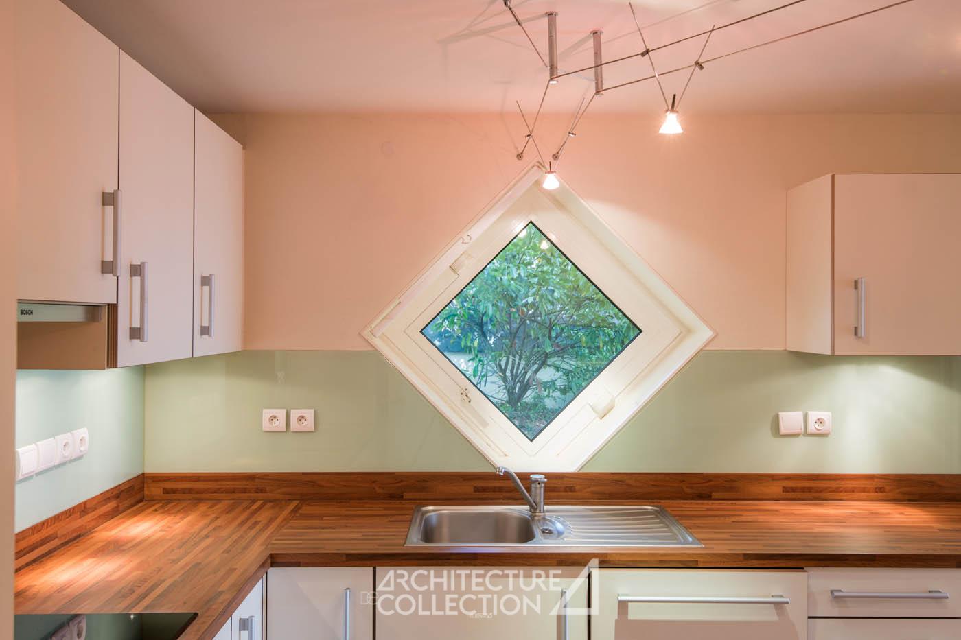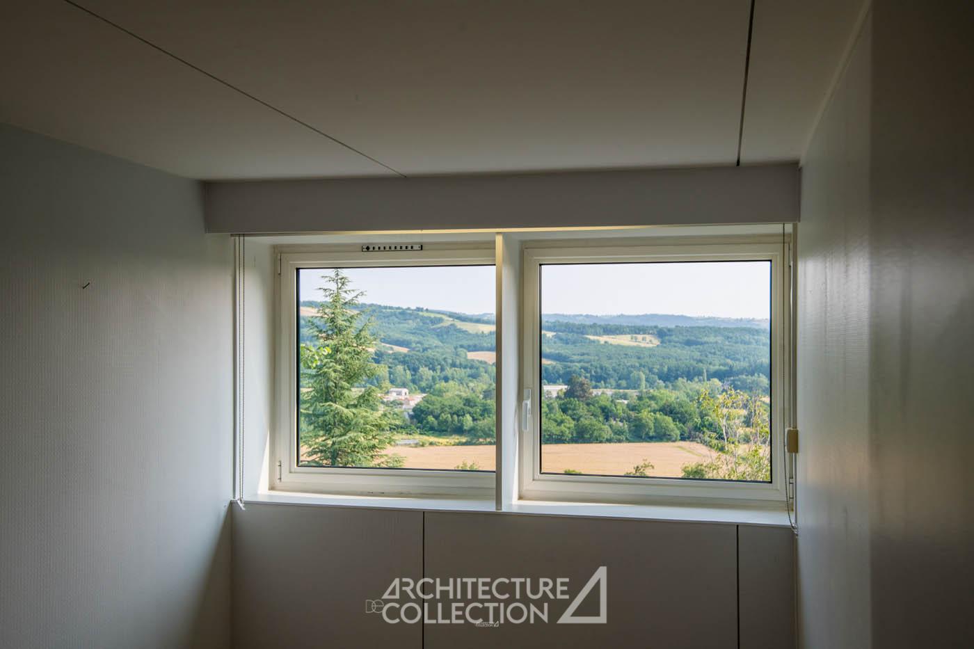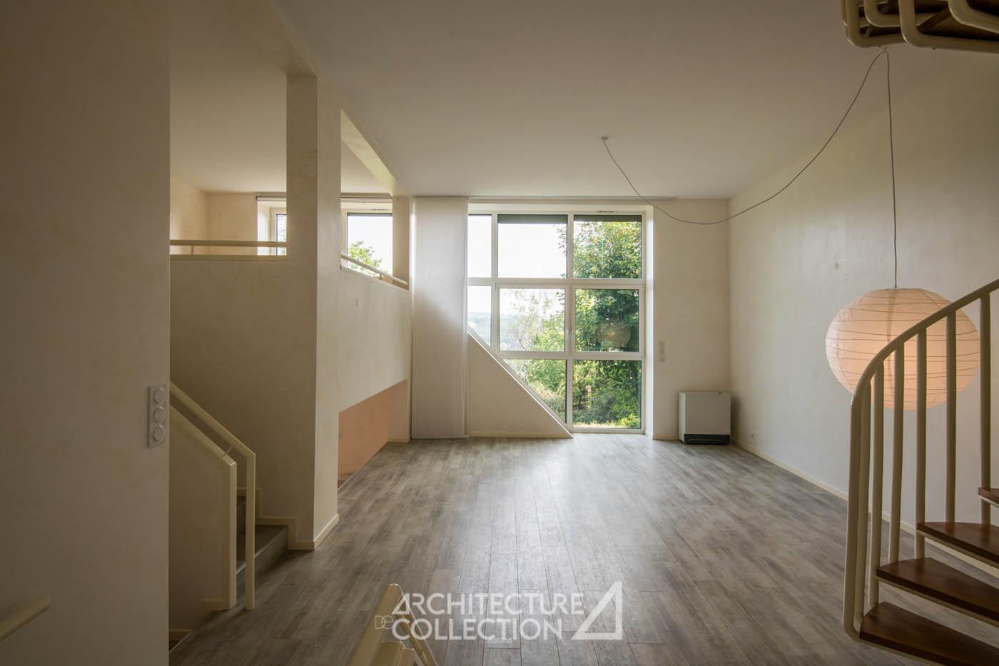 Les architectes ont mis l’accent sur les usages des habitants et ont priorisé la conception des espaces intérieurs sur celle de l’enveloppe architecturale. Dans une conception bioclimatique, une décennie avant l’apparition du terme, la maison offre un lieu de vie très abrité des vents dominants côté nord et largement ouvert sur la vue dégagée côté sud. Son volume compact limite les déperditions d’énergie et optimise les apports en lumière.