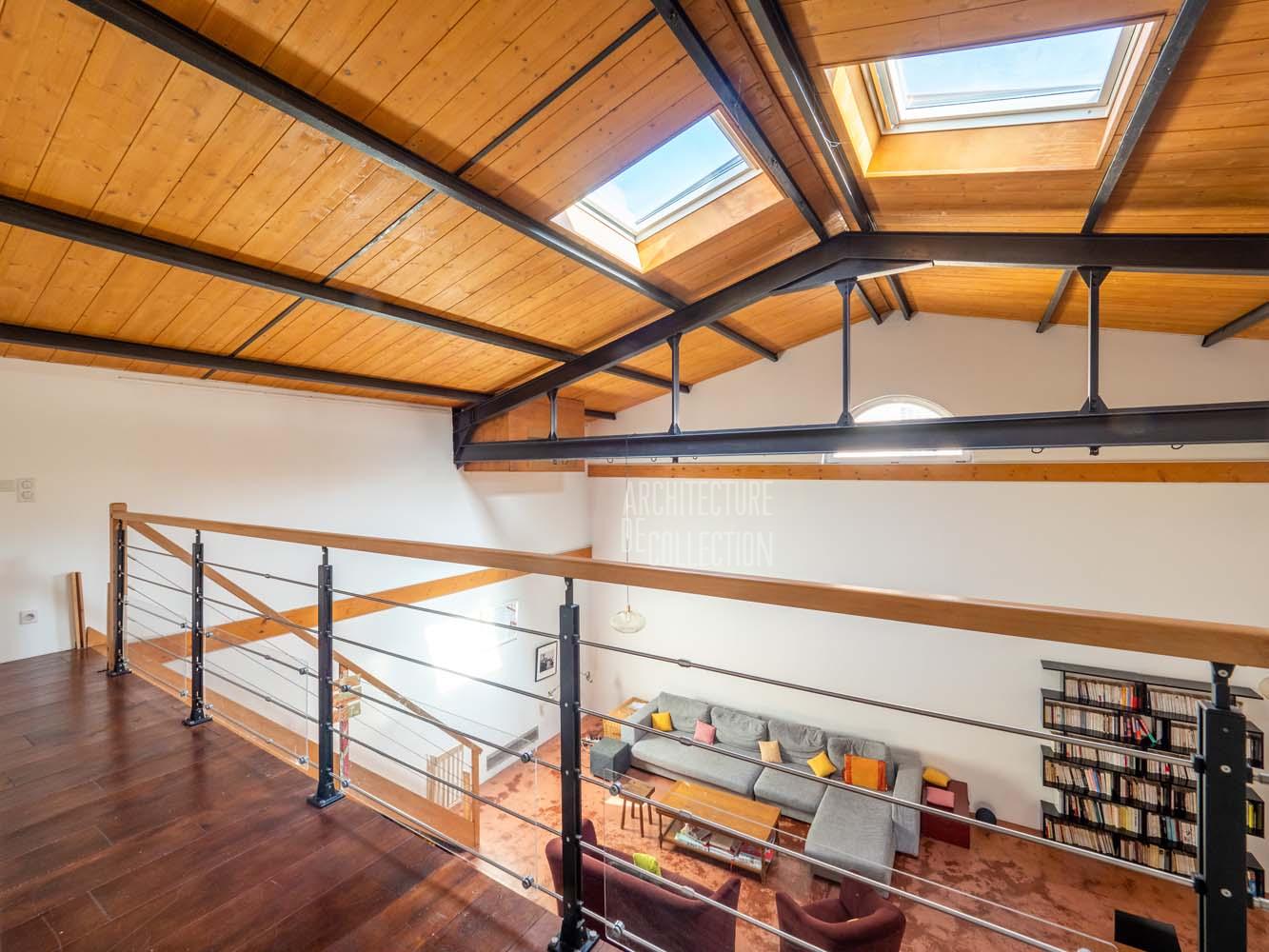 L’identité du lieu a été sublimée par le travail de l’architecte Xavier Bernard, lors de sa première transformation en atelier d’artiste avec espace d’exposition en 2012. La structure métallique du bâtiment a été mise à nu, peinte en noir et laissée apparente pour tirer le meilleur parti du volume disponible. L’emploi du bois au plafond et dans la construction de l’étage réchauffe l’ensemble tout en conservant une esthétique épurée.