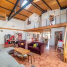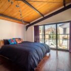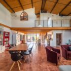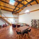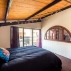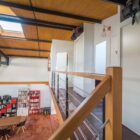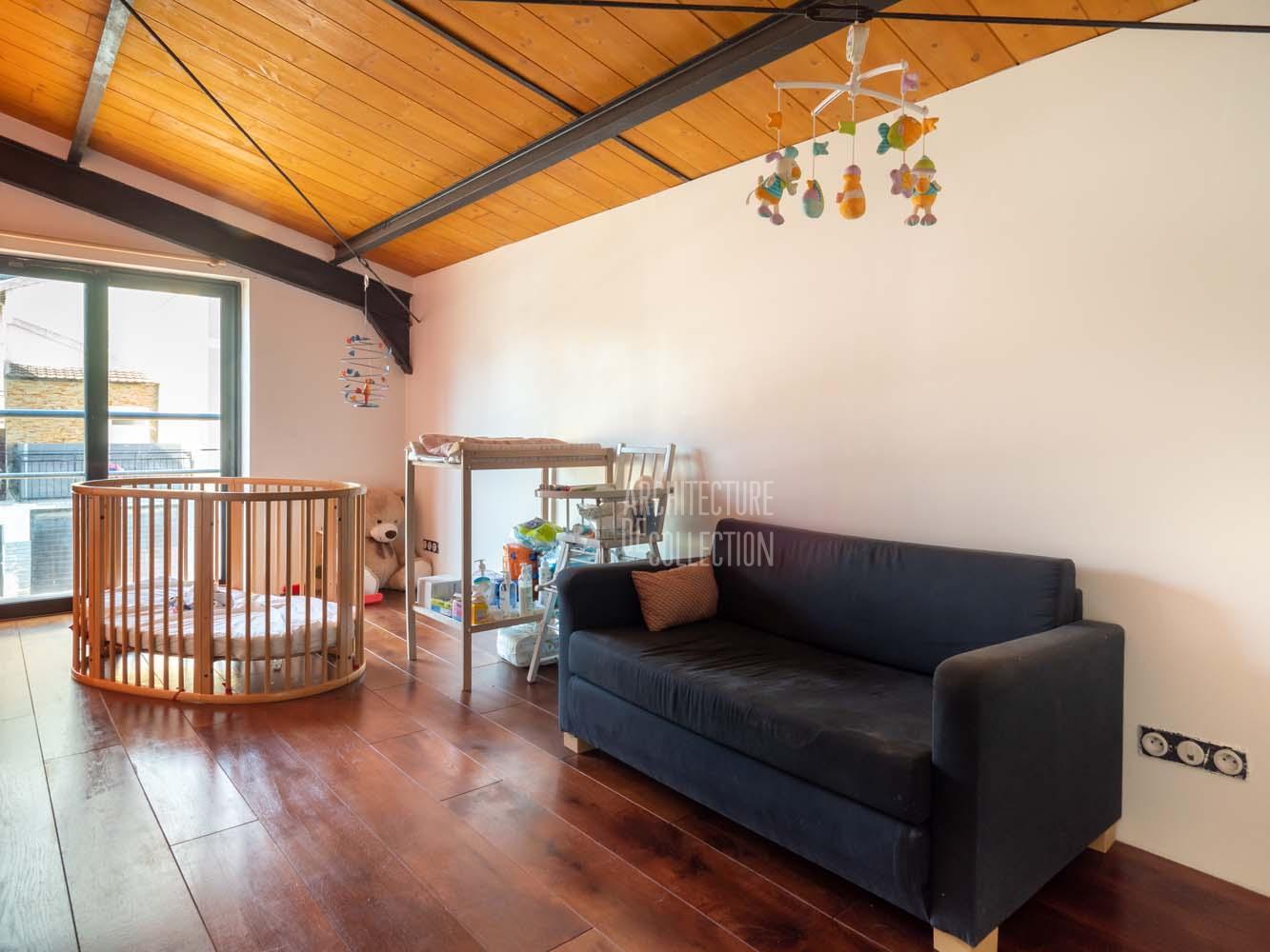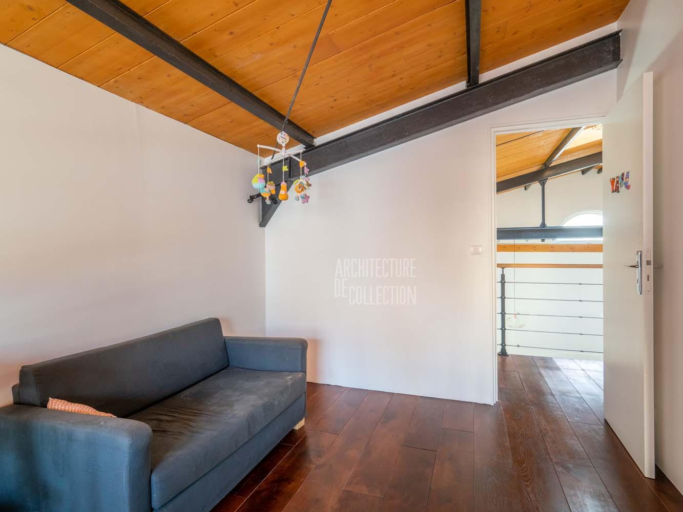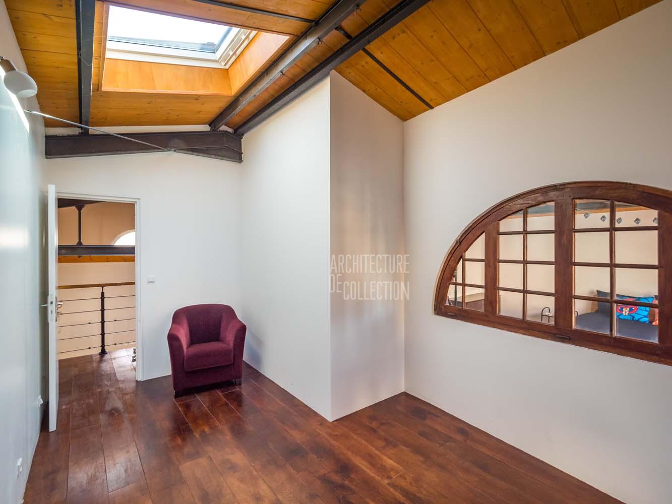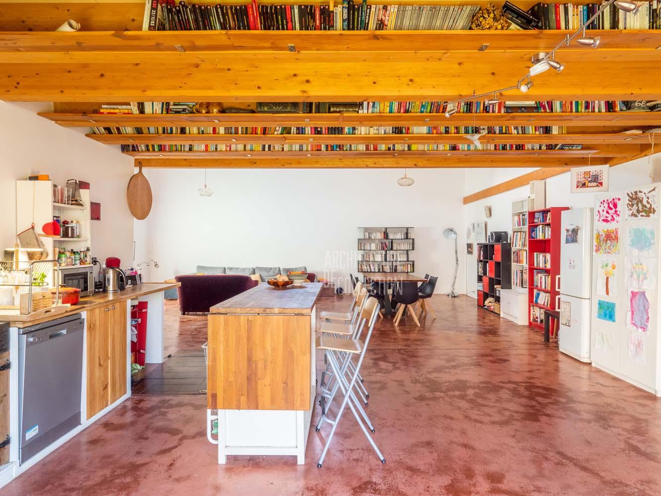 Le sol est recouvert de béton ciré rouge brique au rez-de-chaussée et de parquet massif à l’étage, pour une ambiance chaleureuse. De longues étagères, faisant actuellement office de bibliothèques, sont astucieusement aménagées entre les poutres qui soutiennent l’étage en mezzanine. A l’étage, des huisseries anciennes ont été utilisées pour percer des fenêtres donnant sur le volume principal. Chaque chambre profite par ailleurs d’une ouverture zénithale.