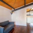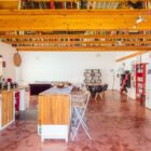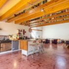 La façade de la maison rappelle son histoire industrielle, avec sa découpe caractéristique initialement destinée à recevoir l’enseigne du garage. Repeinte en rouge vif, elle prend désormais des allures d’hacienda ensoleillée et n’est pas sans évoquer le modernisme latino-américain.
