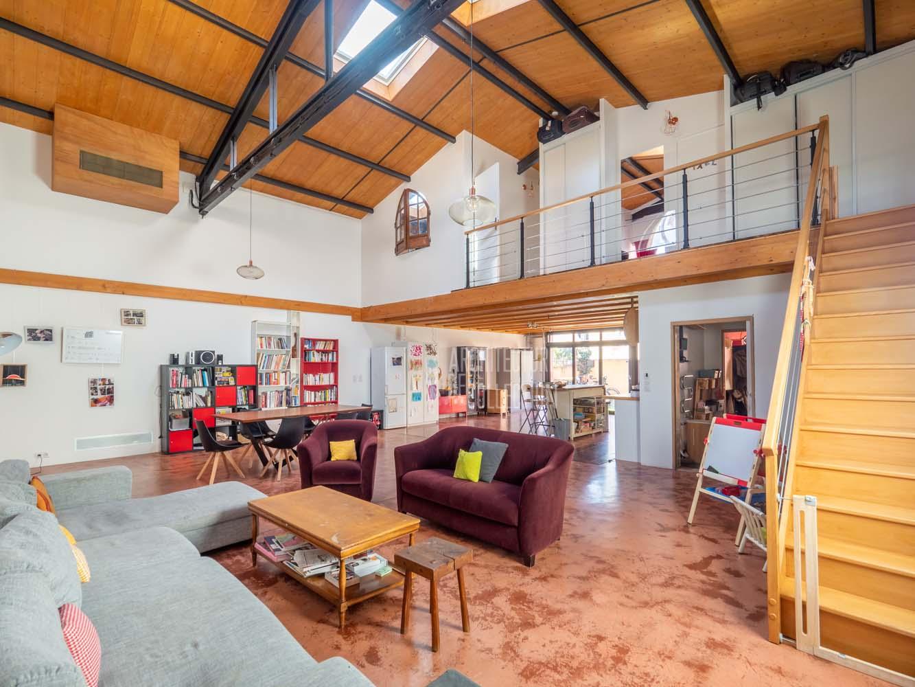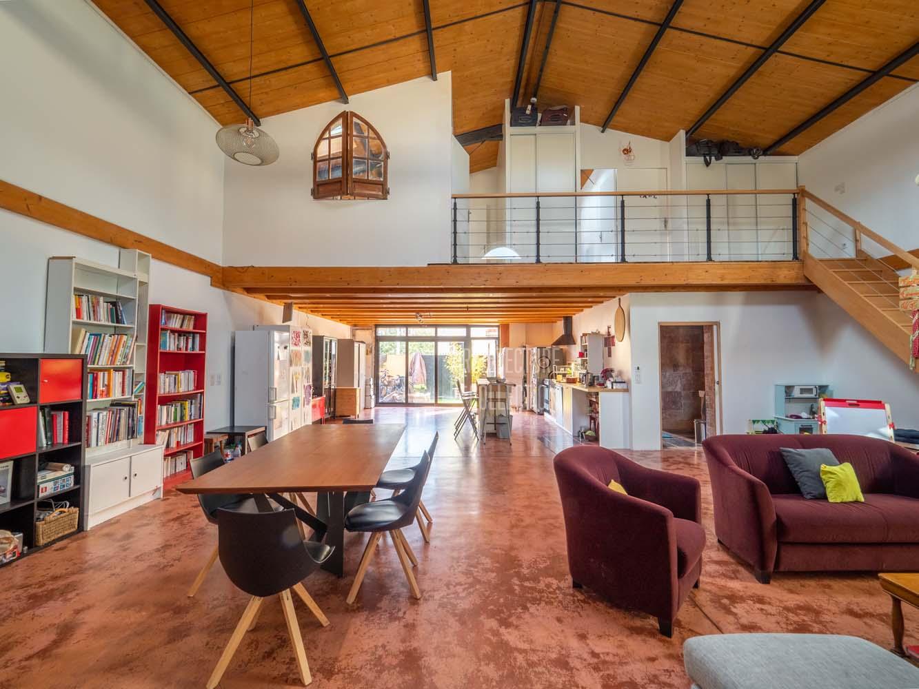 Le rez-de-chaussée est constitué d’un immense plateau d’environ 100 m² sous 6 mètres de hauteur sous plafond, qui accueille un bel espace de vie composé d’un salon- salle à manger et d’une cuisine ouverte, prolongé par la terrasse. Un bureau ouvrant sur la terrasse et une salle de bain complètent ce niveau. L’étage abrite la partie nuit comprenant trois belles chambres et une deuxième salle de bain dotée d’une grande baignoire à jets. La maison comprend également une cave de 10 m².