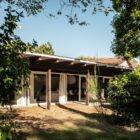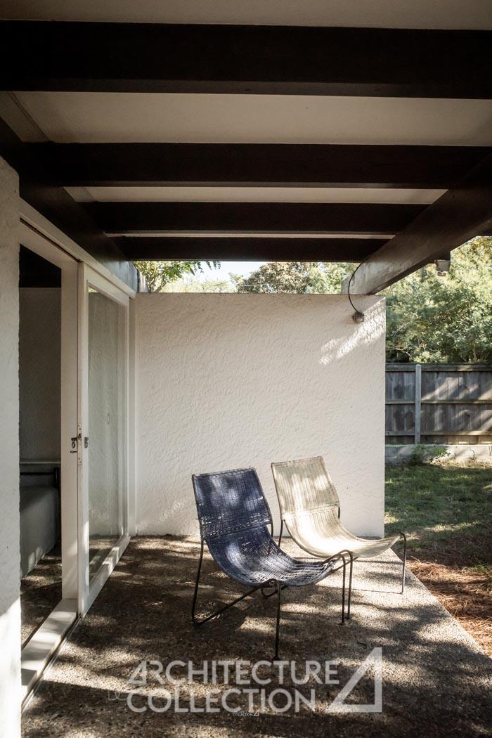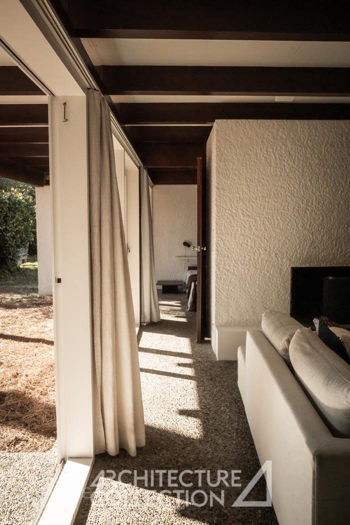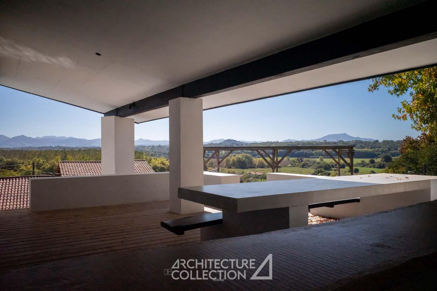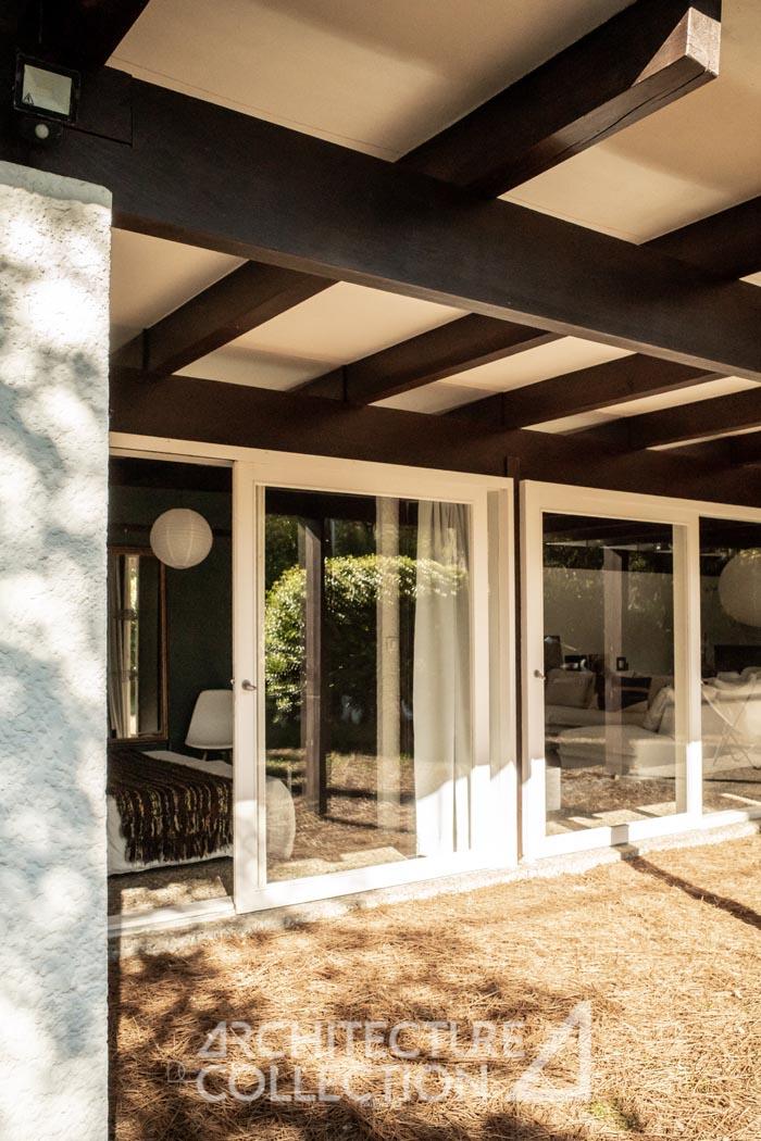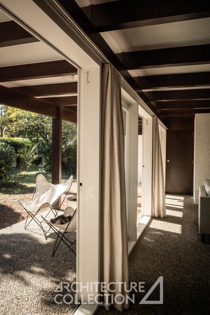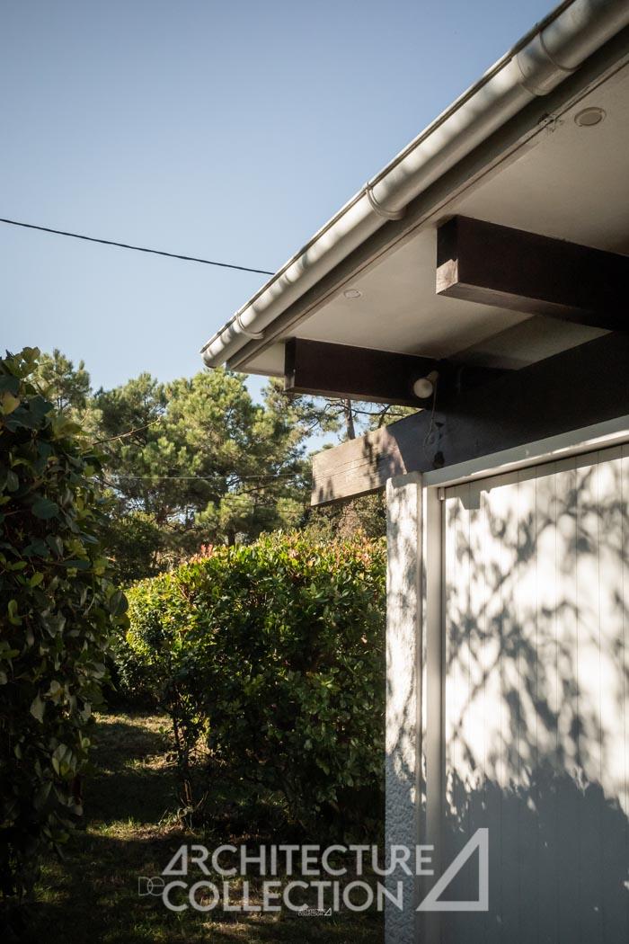 L’architecture s’articule autour d’une trame poteaux-poutres en bois apparents, libérant l’espace et permettant de vastes ouvertures. La toiture plate, à larges débords, portée par une ossature légère, assure une protection solaire tout en évoquant la légèreté de la Farnsworth House de Mies van der Rohe, adaptée au climat atlantique.