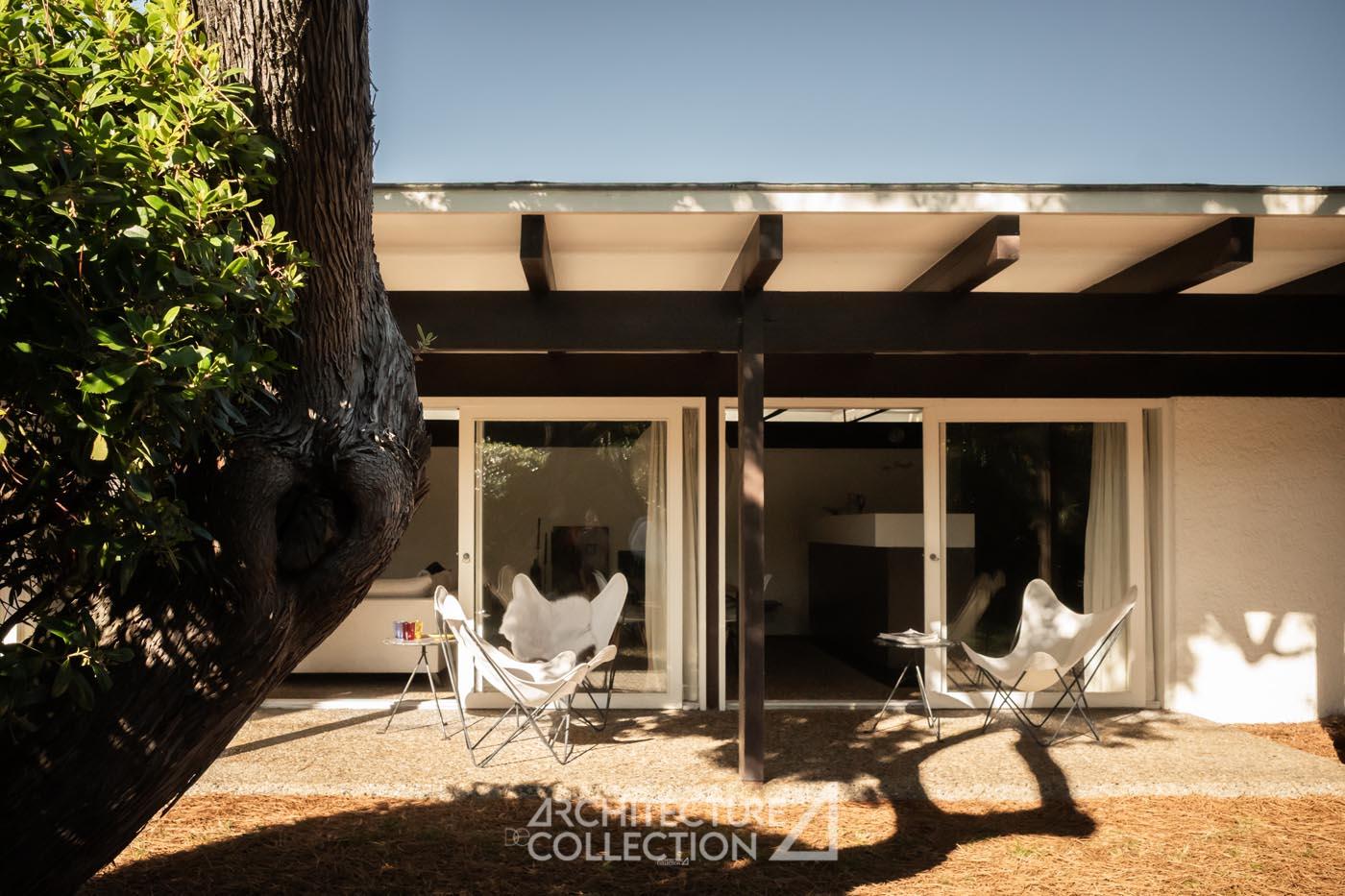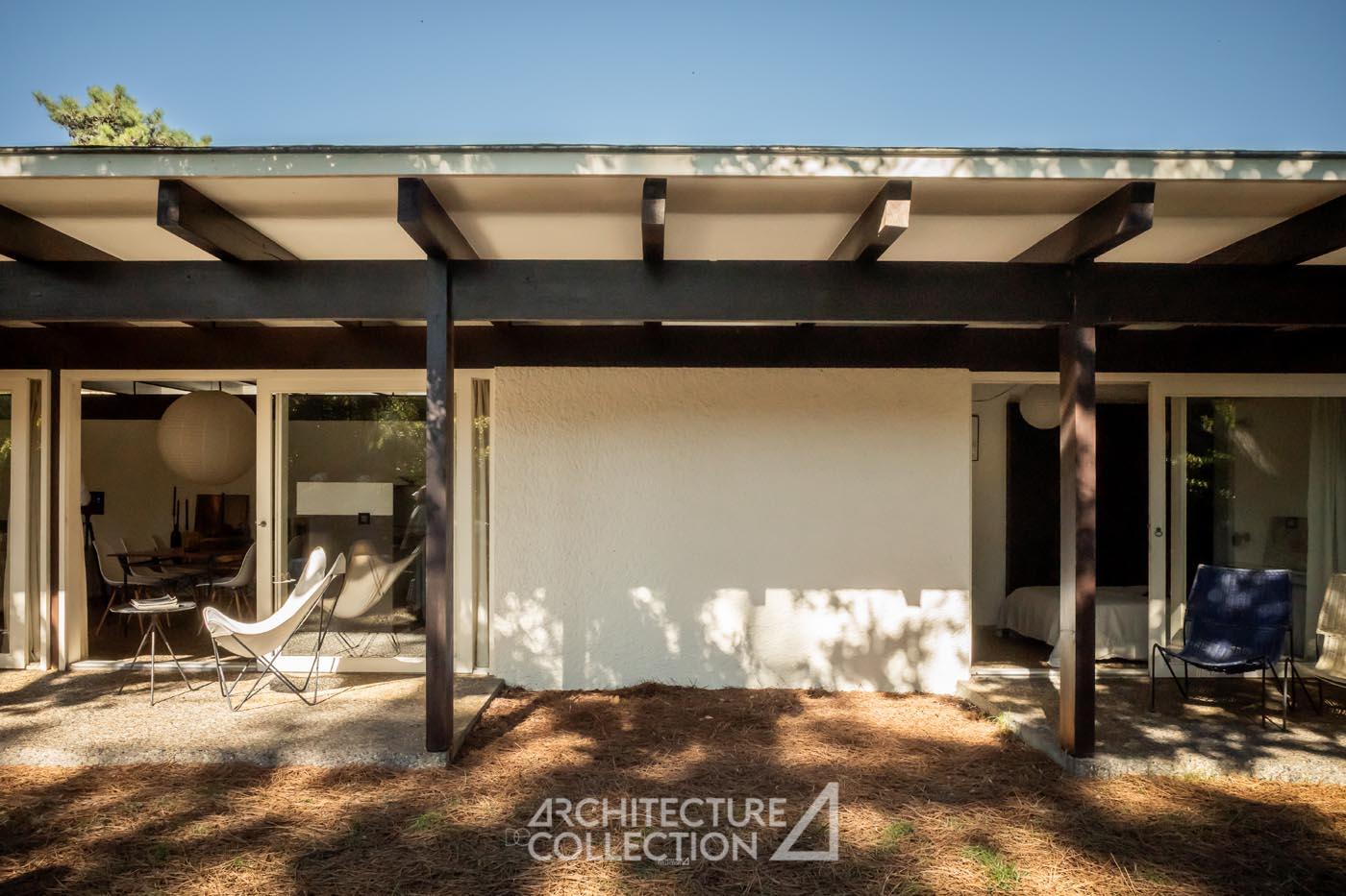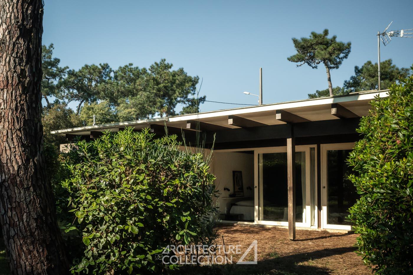 Entre forêt et océan, cette maison de plain-pied conçue par l’architecte Louis Gombeaud incarne l’essence du modernisme de la côte atlantique. Elle se présente comme un manifeste architectural discret, où la lumière, le bois et le paysage dialoguent.