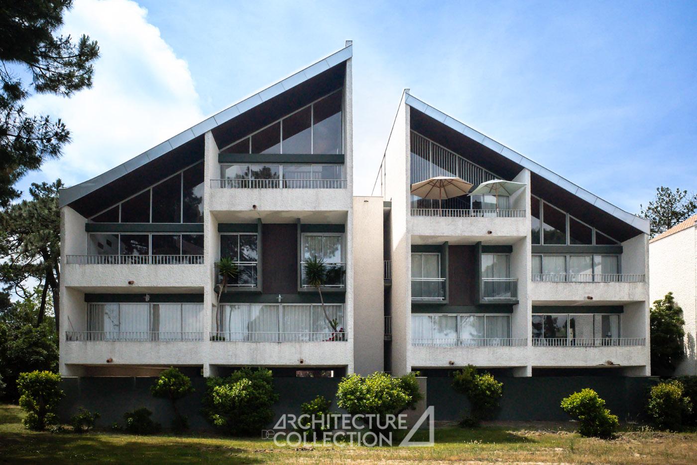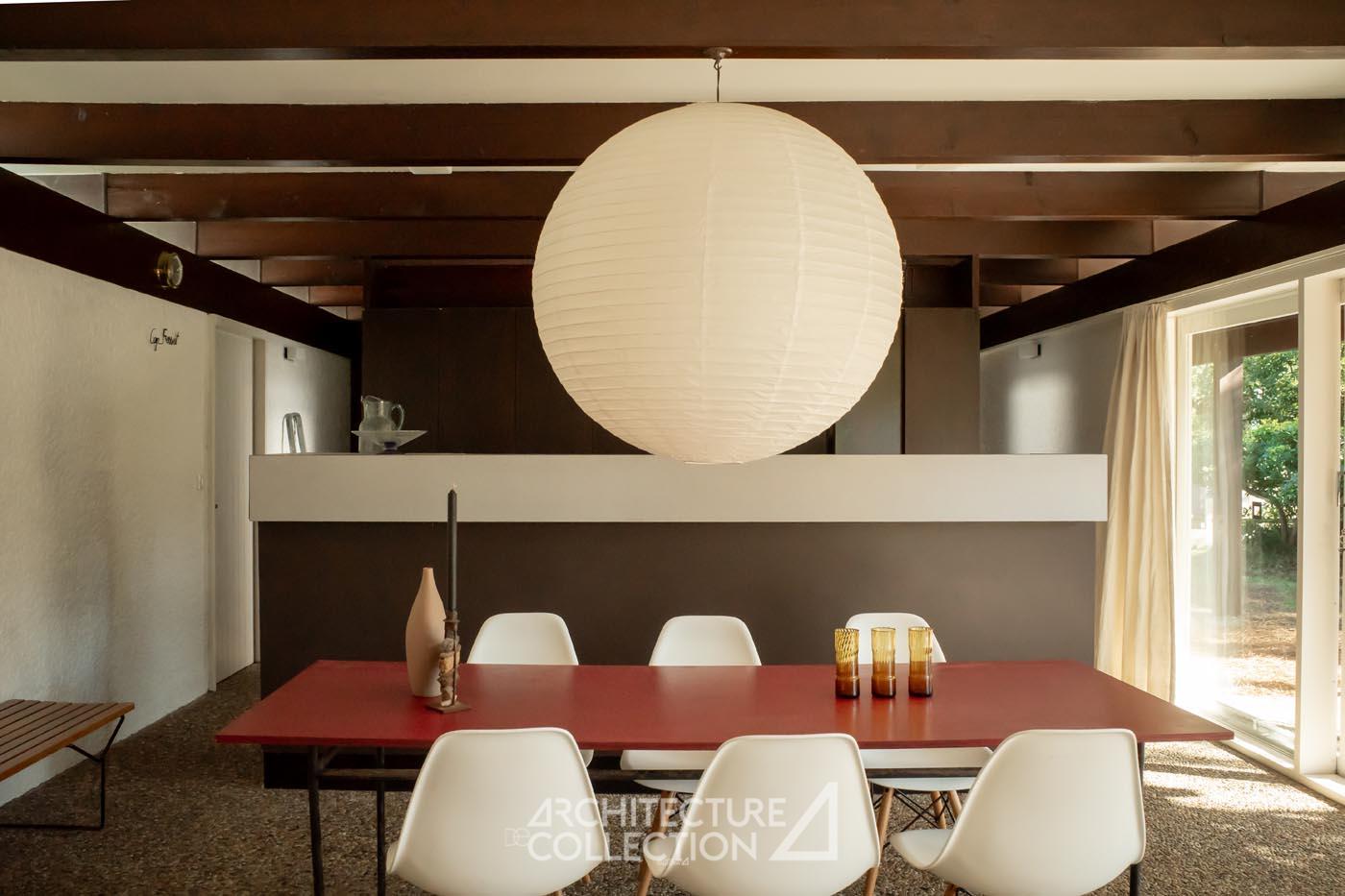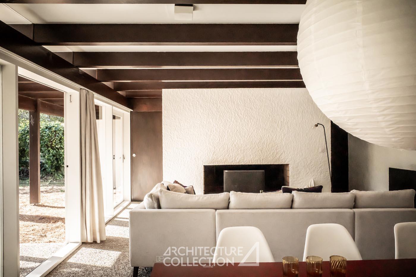Entre forêt et océan, cette maison de plain-pied conçue par l’architecte Louis Gombeaud incarne l’essence du modernisme de la côte atlantique. Elle se présente comme un manifeste architectural discret, où la lumière, le bois et le paysage dialoguent.
