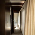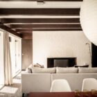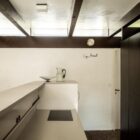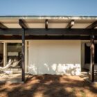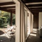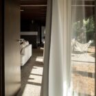 La façade sud, grâce à ses baies vitrées coulissantes pleine hauteur, crée un dialogue constant entre intérieur et extérieur, s’ouvrant sur une terrasse couverte qui prolonge l’espace de vie. La façade nord, quant à elle, est dotée d’une haute fenêtre en bandeau, assurant un éclairage zénithal. La lumière, filtrée par les stores et réfléchie par les poutres, est ici considérée comme un élément matériel à part entière.