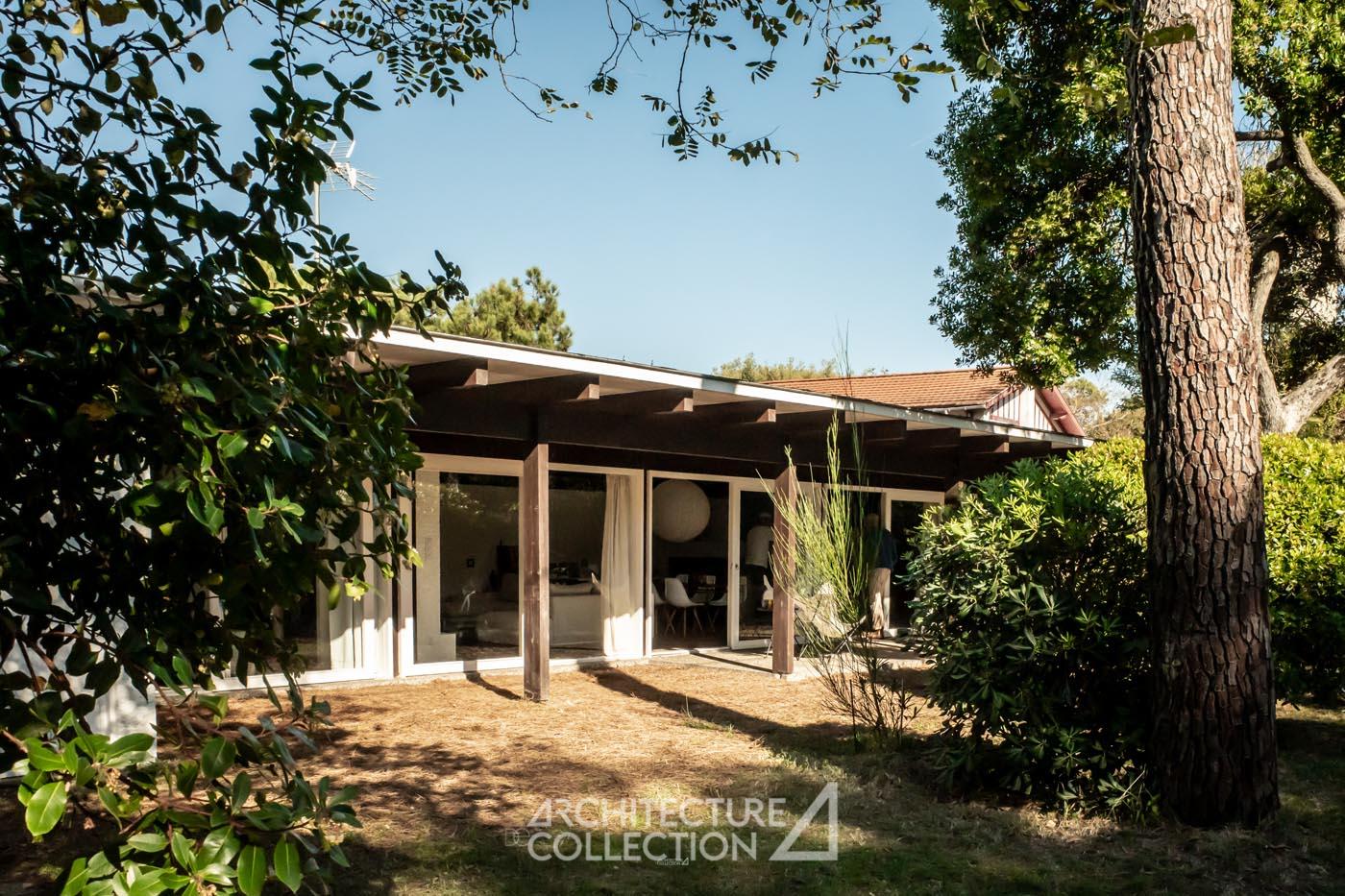 Entre forêt et océan, cette maison de plain-pied conçue par l’architecte Louis Gombeaud incarne l’essence du modernisme de la côte atlantique. Elle se présente comme un manifeste architectural discret, où la lumière, le bois et le paysage dialoguent.