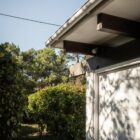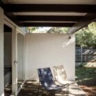 La façade sud, grâce à ses baies vitrées coulissantes pleine hauteur, crée un dialogue constant entre intérieur et extérieur, s’ouvrant sur une terrasse couverte qui prolonge l’espace de vie. La façade nord, quant à elle, est dotée d’une haute fenêtre en bandeau, assurant un éclairage zénithal. La lumière, filtrée par les stores et réfléchie par les poutres, est ici considérée comme un élément matériel à part entière.