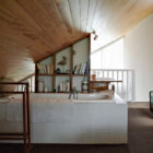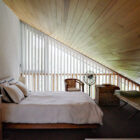 Un escalier dessert la partie nuit au niveau inférieur, composée de deux chambres avec vue panoramique sur un paysage de pins, et d’une salle d’eau.