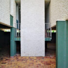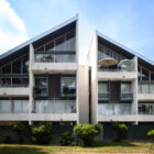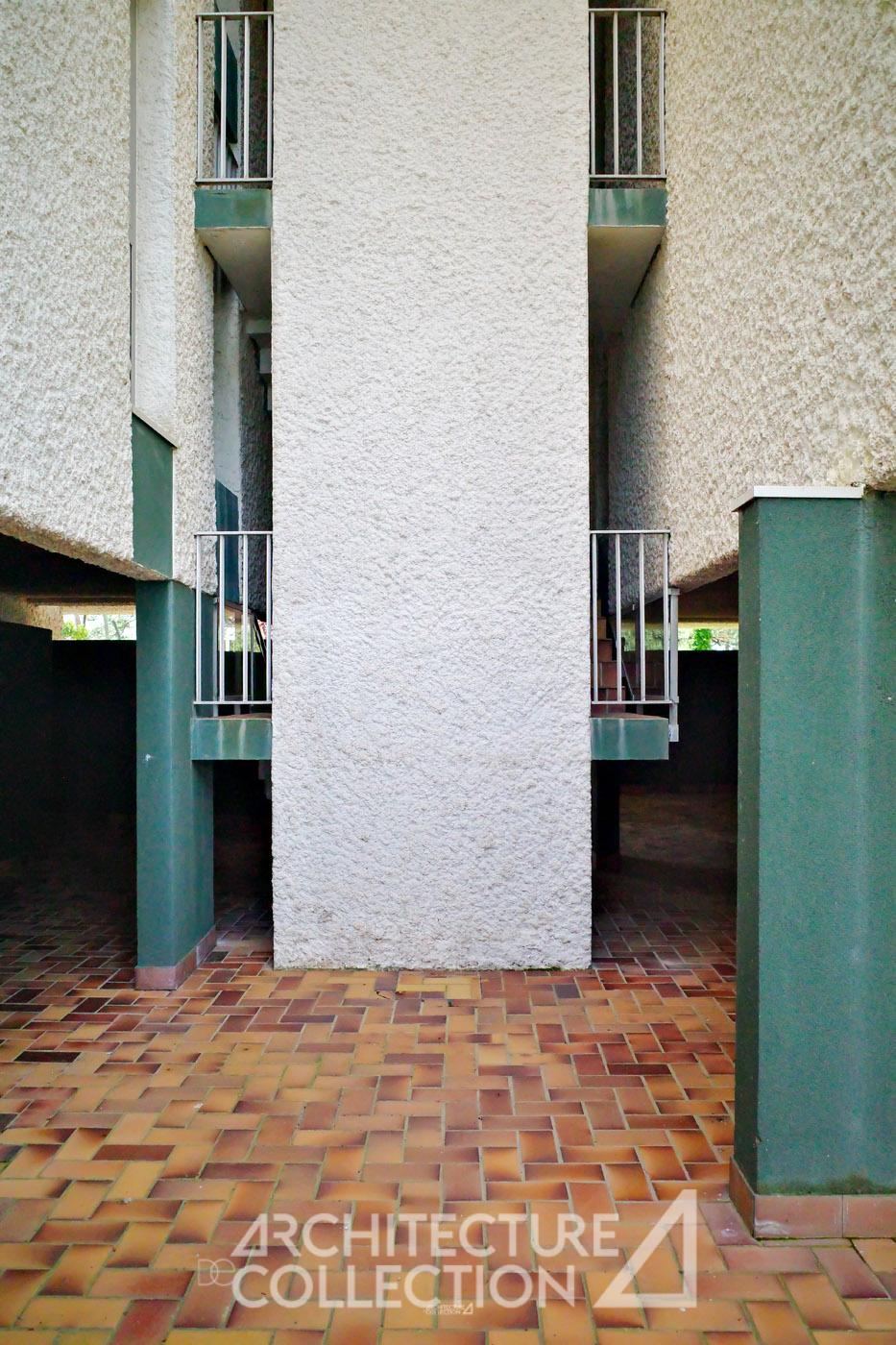 Le dessin d’ensemble de la résidence exprime une esthétique harmonieuse, où le modernisme assimile les formes locales. Son architecte, Francis Lafont, cherche à donner à l’ensemble un volume en pointe, qui puisse, depuis le bassin, s’apparenter aux pentes de toiture d’une vaste villa. Son architecture est pensée pour habiter le paysage plus que pour s’y imposer. En façade, la trame orthogonale des balcons et des ouvertures dialogue avec les lignes obliques des toitures, qui puisent dans une écriture vernaculaire. Les jeux de volumes sont accentués par les choix de matériaux : la massivité du béton blanc enduit, typiquement seventies, est soulignée par la transparence du verre et par l’élégance du bardage bois. L’ensemble est posé sur un socle surélevé qui laisse filer la lumière, soutenu par des pilotis abritant les caves et les espaces communs.
