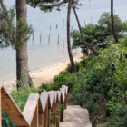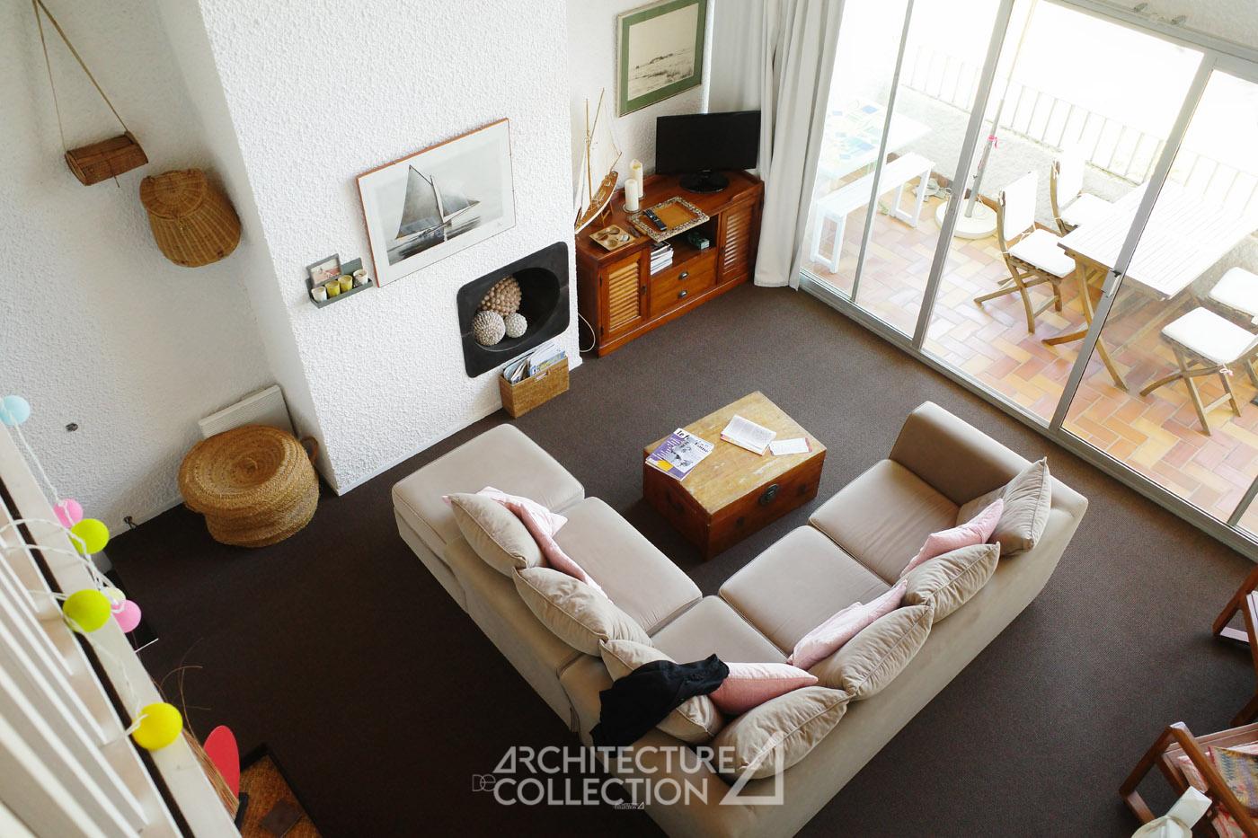 L’appartement prend place dans le bâtiment le plus en retrait de la résidence, bénéficiant ainsi d’un calme absolu et d’une vue dégagée, sans aucun obstacle, sur le miroir changeant des marées et l’île aux Oiseaux à l’horizon. On y accède non pas par un hall impersonnel mais par une circulation extérieure à l’air libre immergée dans la pinède, presque comme dans une maison en hauteur. Il conjugue le confort d’une maison – grâce à ses multiples niveaux et ses volumes généreux – avec la praticité d’un appartement : entretien facilité, sécurité, et présence d’un gardien sur place.