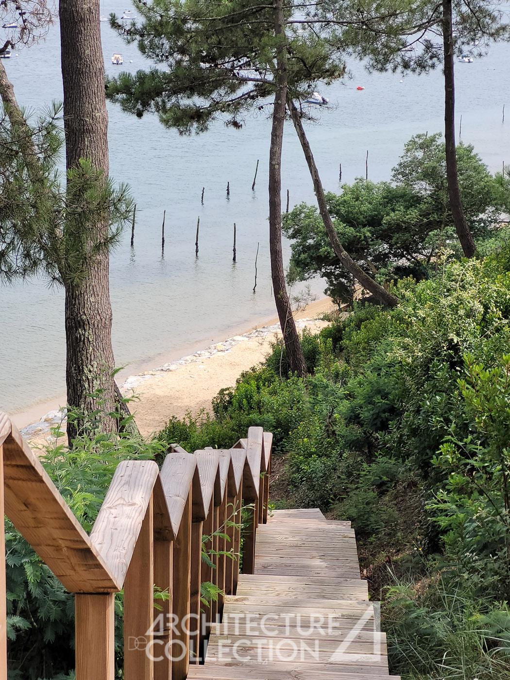 Pensée comme un hameau perché dans les pins, la résidence s’inscrit dans un parc privé de plus de quatre hectares, agrémenté d’une piscine, de deux terrains de tennis, et d’un accès direct aux plages du Bassin.