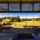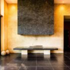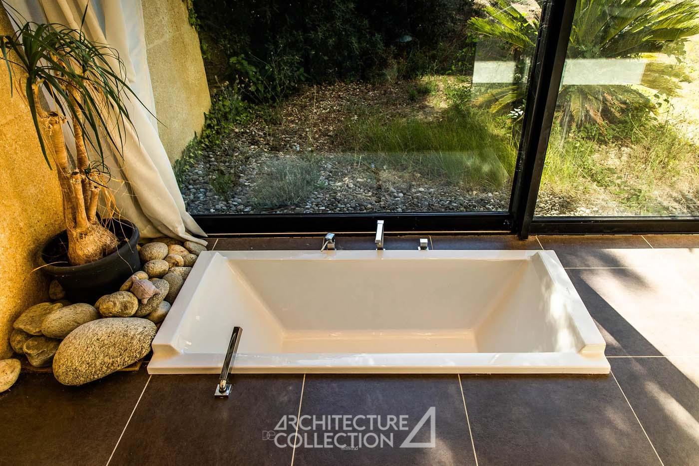 L’architecte dessine une composition d’ensemble à la géométrie minimaliste qui intègre des jeux de retraits, des pleins et des vides. Les murs porteurs latéraux, monolithiques, supportent la structure du toit, permettant des façades libres cadrées sur l’extérieur. De cette structure orthogonale se dégage une certaine harmonie qui inscrit parfaitement la maison dans son environnement naturel. Le choix de la pierre du Gard, matériau local par excellence, participe de cette intégration.