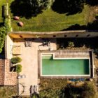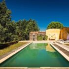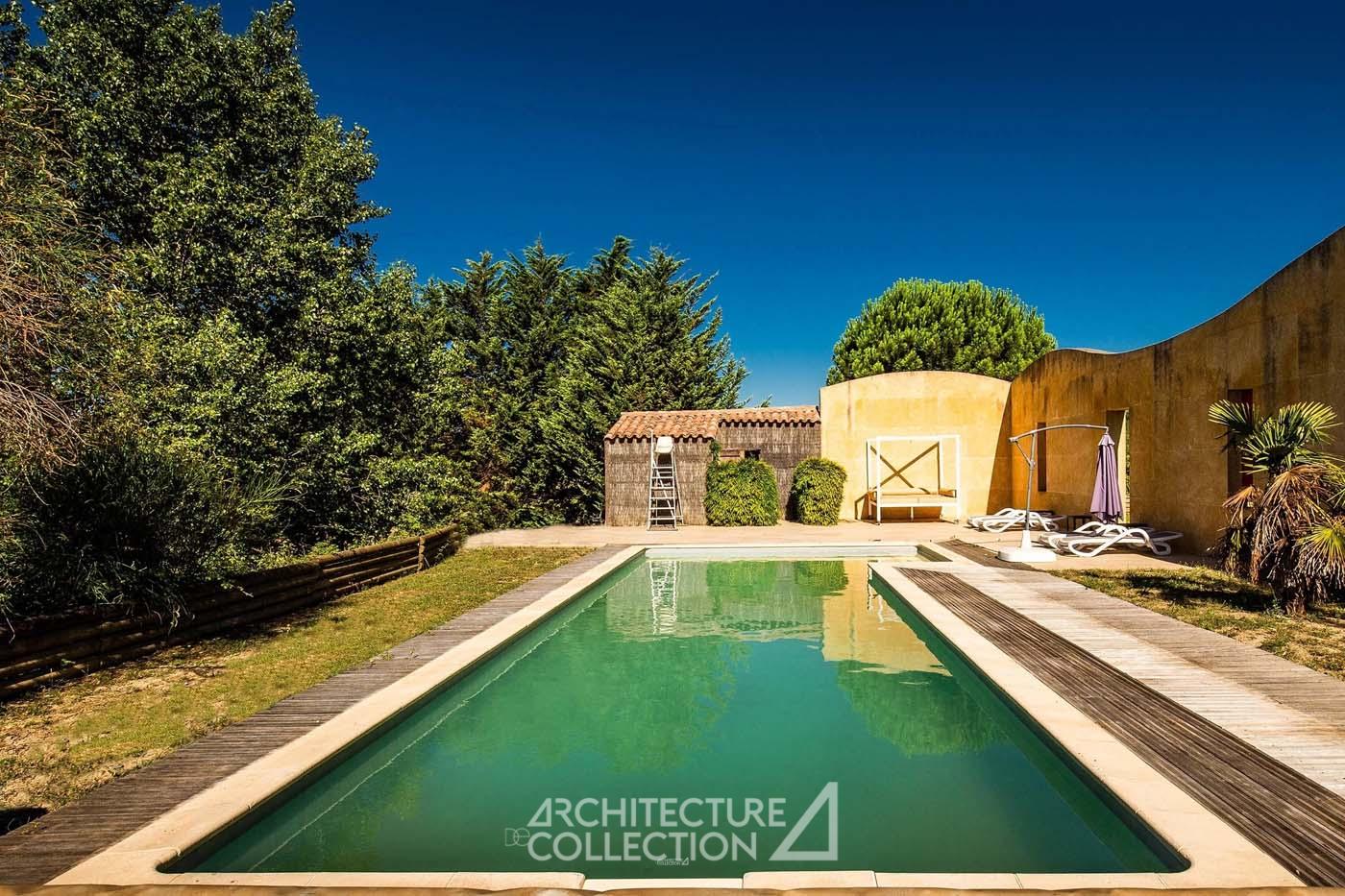 La propriété profite d’une piscine de 10 mètres par 6 avec pool house, isolée de la villa par un mur en pierre du Gard.