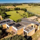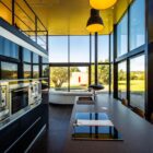 A l’intérieur, l’entrée se fait par un couloir oblique couvert par une voûte en zinc qui crée une rupture avec l’orthogonalité du plan d’ensemble. La maison offre des prestations de qualité, comme la cheminée Focus, les panneaux solaires installés sur le toit ou les équipements professionnels de la cuisine.