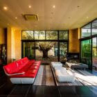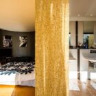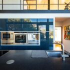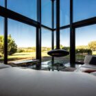 La seconde aile, initialement réservée aux propriétaires, accueille un séjour vitré en double hauteur avec cheminée suspendue, une cuisine ouverte tout équipée, une grande chambre avec salle d’eau et dressing ainsi qu’un bureau en mezzanine. L’ensemble ouvre sur un jardin, sans vis à vis sur l’autre partie de la maison.