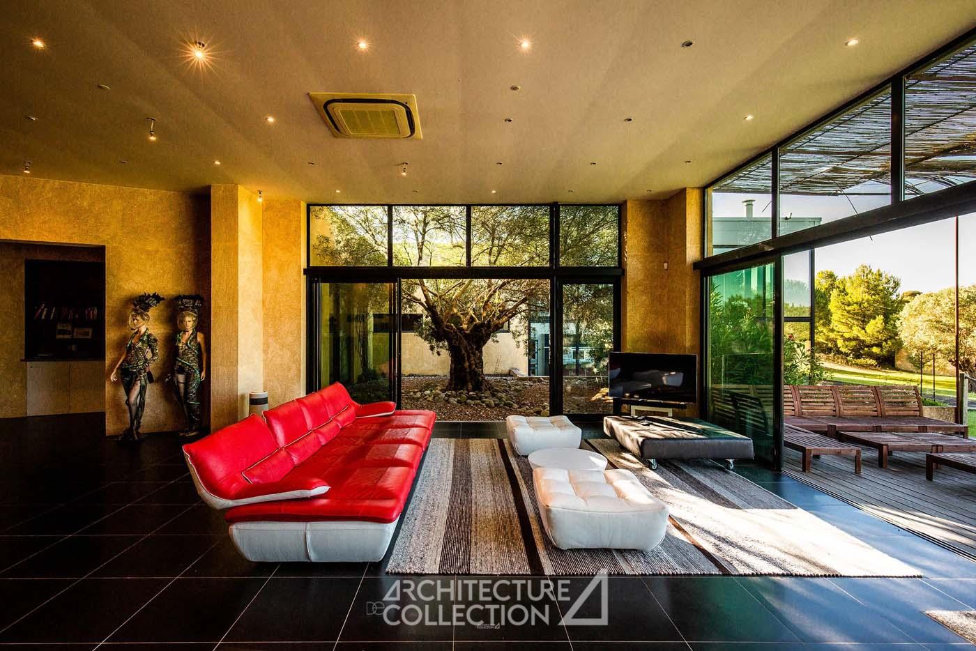 Au sein d’un terrain paysagé de 2 hectares planté d’oliviers centenaires, cette villa déploie une surface habitable de plus de 600 m². Prévue initialement pour accueillir une activité hôtelière, elle s’organise en deux parties.