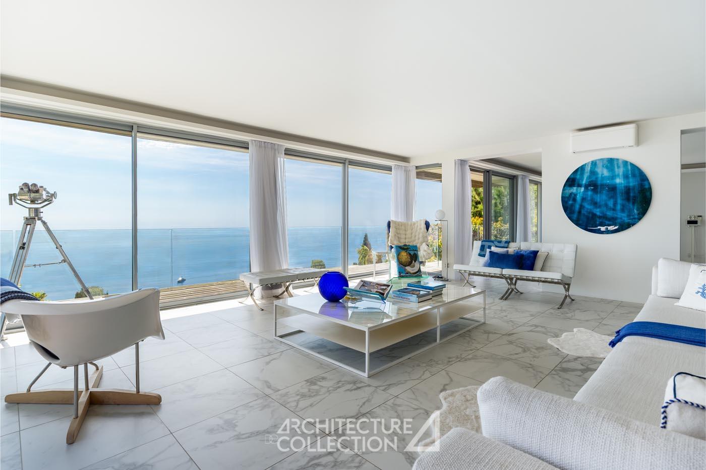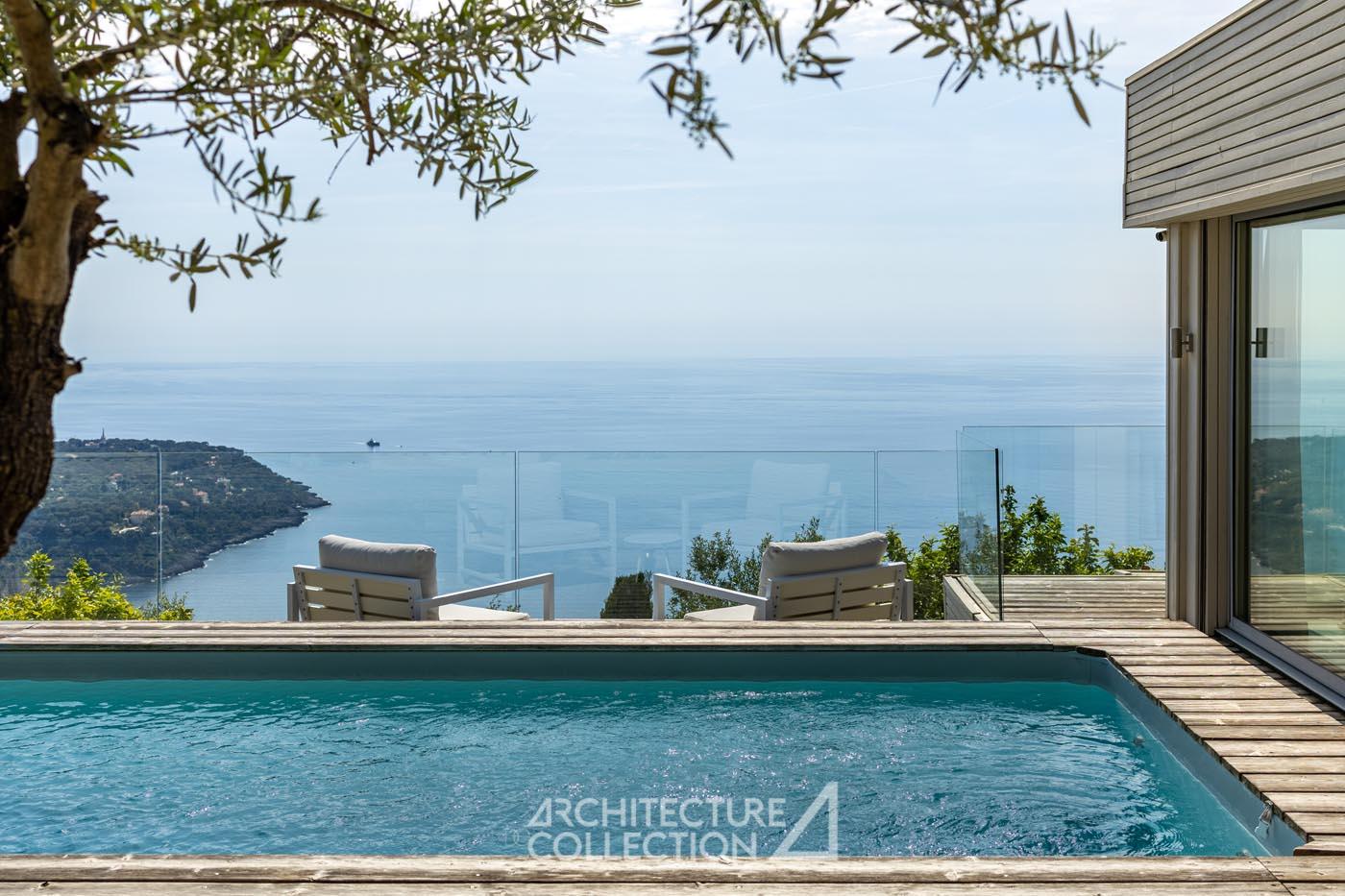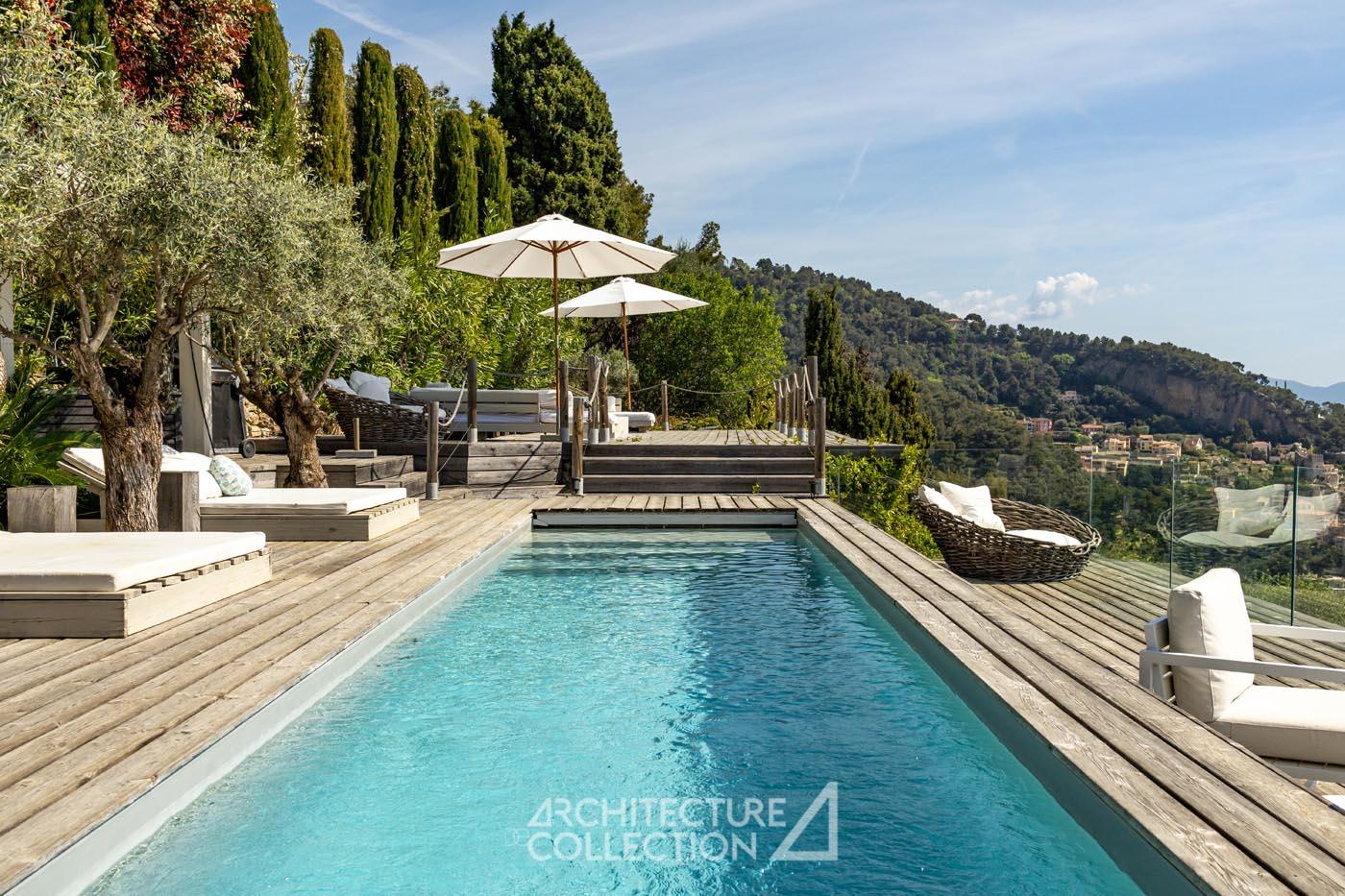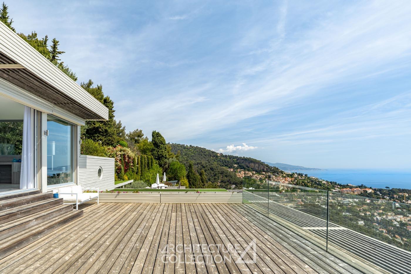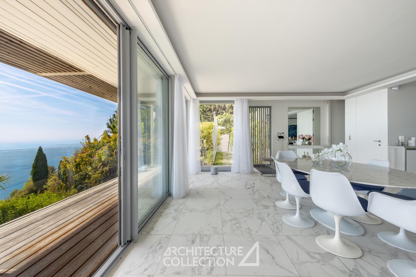 A 300 m au-dessus de la mer, cette villa contemporaine offre des vues dominantes sur le Cap Martin, le Golfe Bleu et le village de Roquebrune. Réhabilitée en 2016, elle prend place au sein d’un terrain paysagé de plus de 2 000 m².