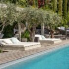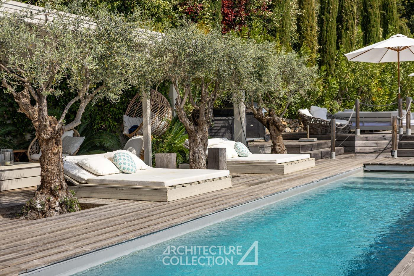 Les extérieurs de la villa proposent de nombreux aménagements et espaces de réception : quatre terrasses, un salon de jardin, deux salles à manger dont une couverte permettant d’accueillir douze invités, une piscine avec douche extérieure et un jardin planté de plus de 600 sujets de 120 espèces.