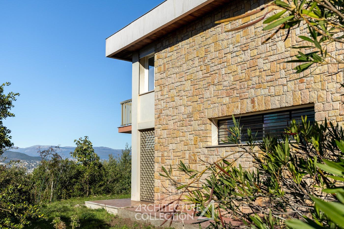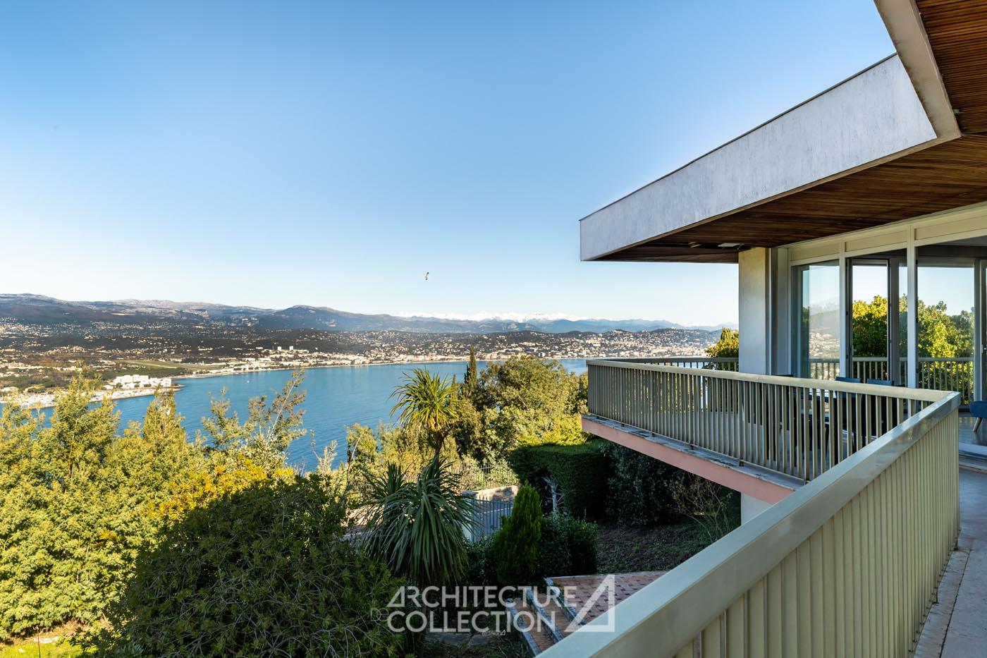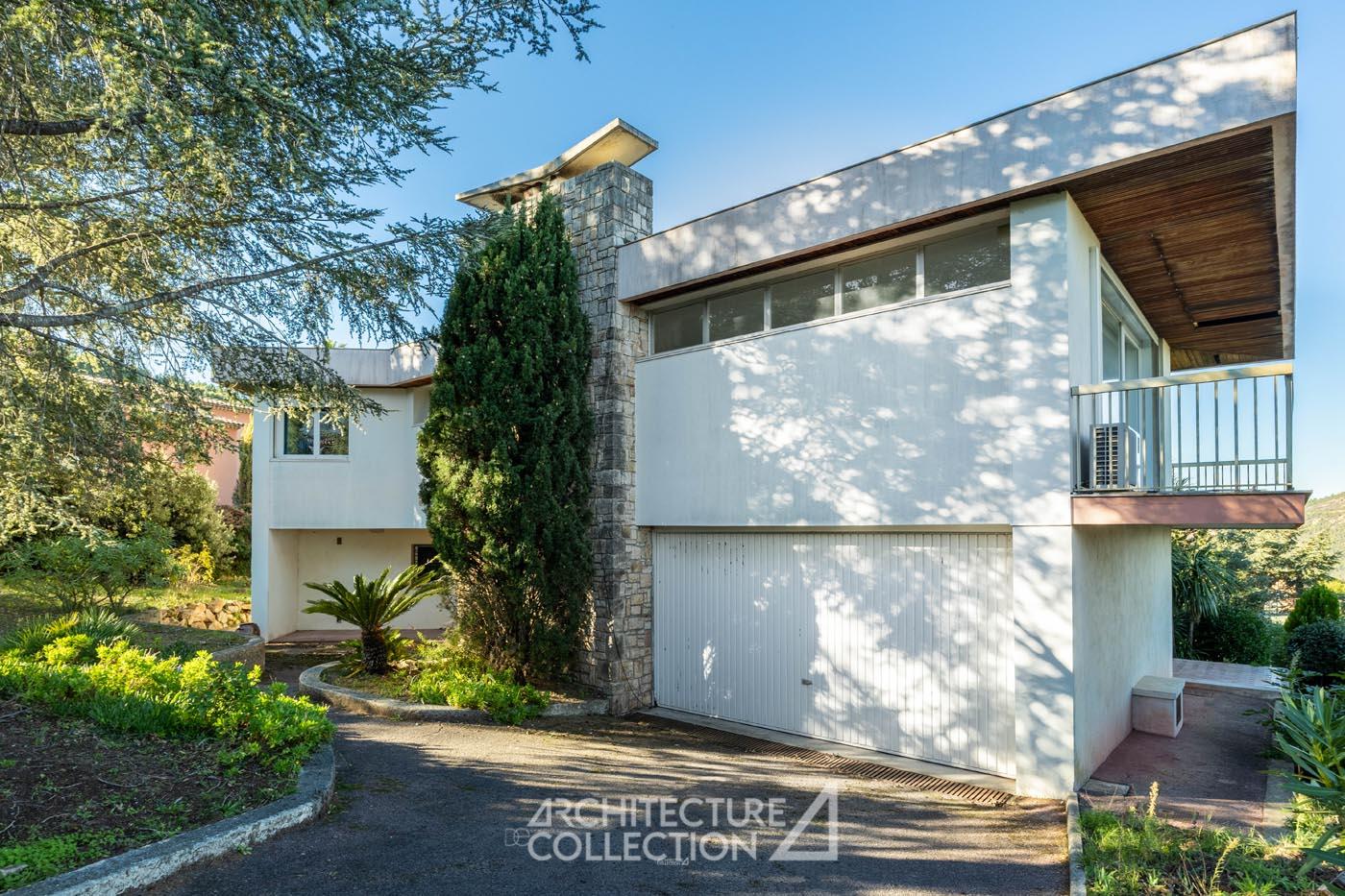 Edifiée dans les années 1970 sur les hauteurs de Théoule-sur-Mer, cette villa d’inspiration californienne signée Eugène Lizero se déploie sur un vaste terrain arboré et offre une vue imprenable sur toute la baie de Cannes.