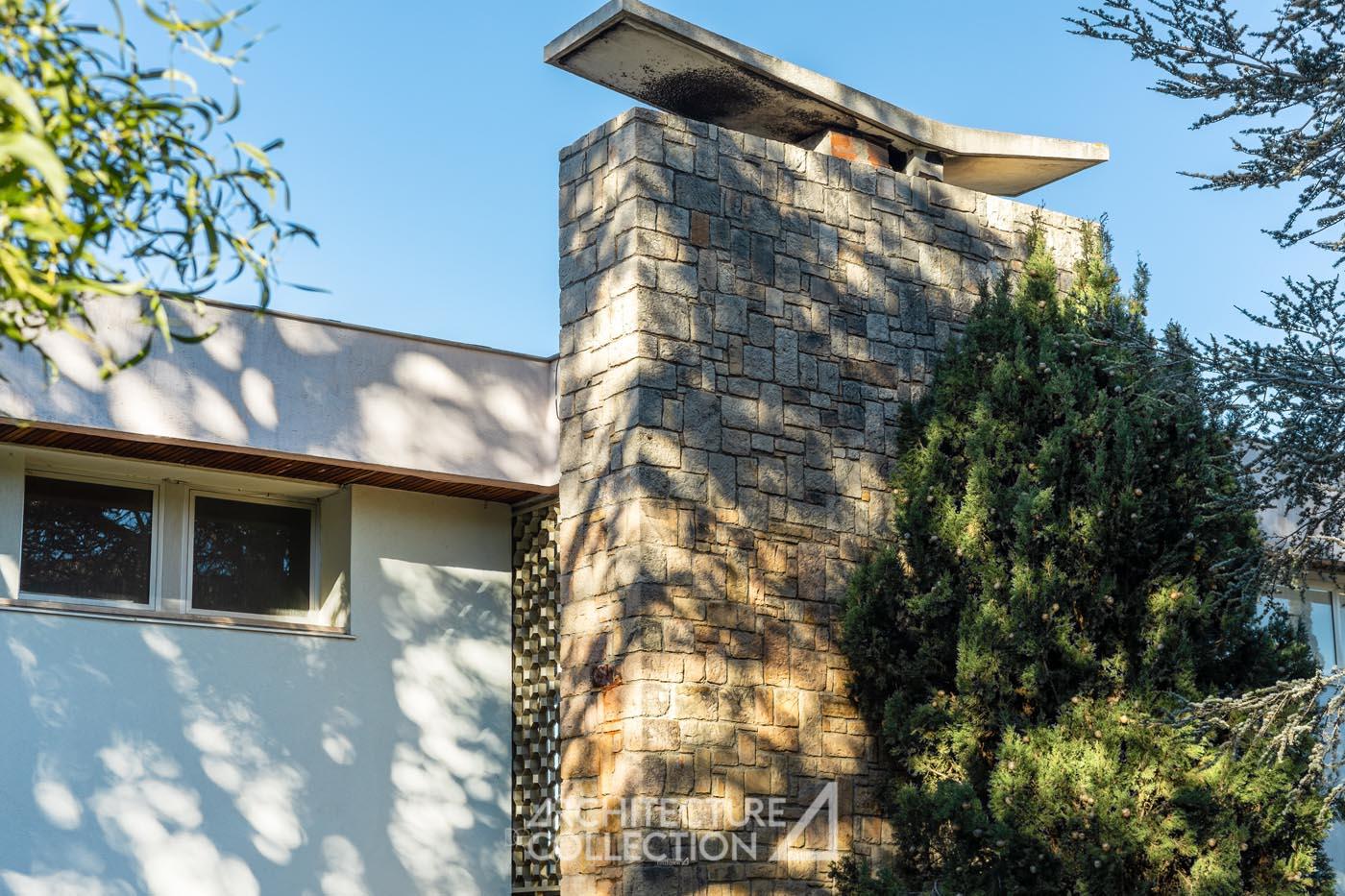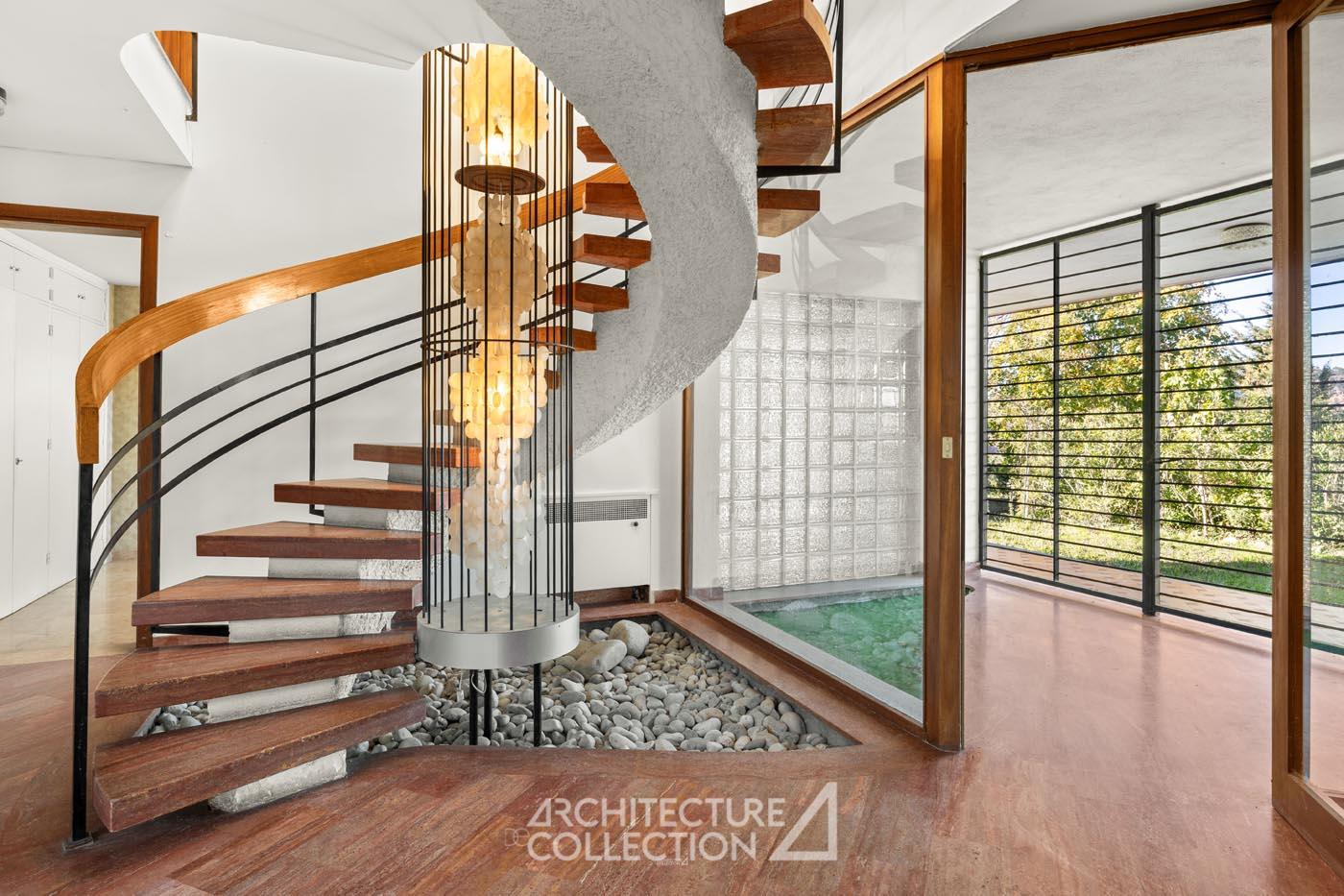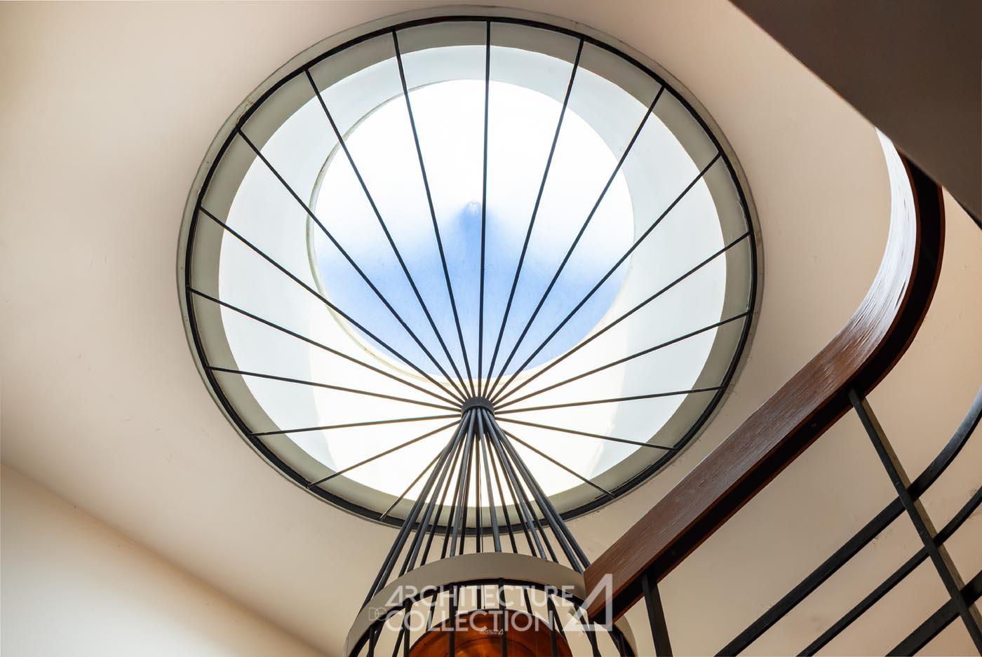 Cette villa incarne une interprétation méditerranéenne de l’architecture résidentielle californienne des années 1960, alliant lignes horizontales affirmées, percées visuelles et continuité entre l’intérieur et l’extérieur. La lumière naturelle joue un rôle central : puits de lumière circulaires, baies vitrées généreuses et jeux de transparences verticales et horizontales rythment les espaces.