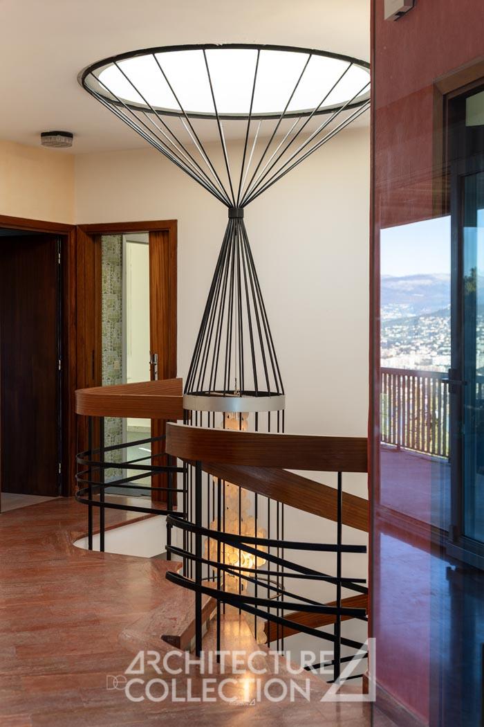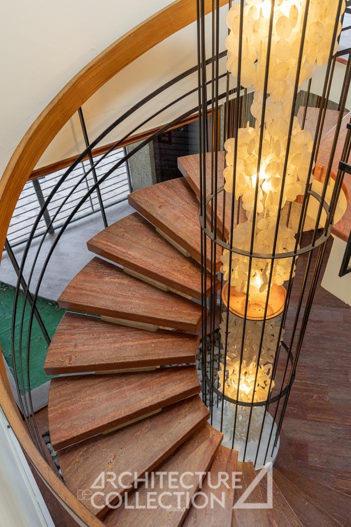 L’entrée, marquée par une porte à pivot en bois d’origine, s’ouvre sur un escalier hélicoïdal sculptural. Ses finitions mêlent bois et fer forgé, et un luminaire est intégré au cœur de sa structure. Cet espace lumineux et traversant est également caractérisé par le travertin iranien rouge que revêt son sol.
