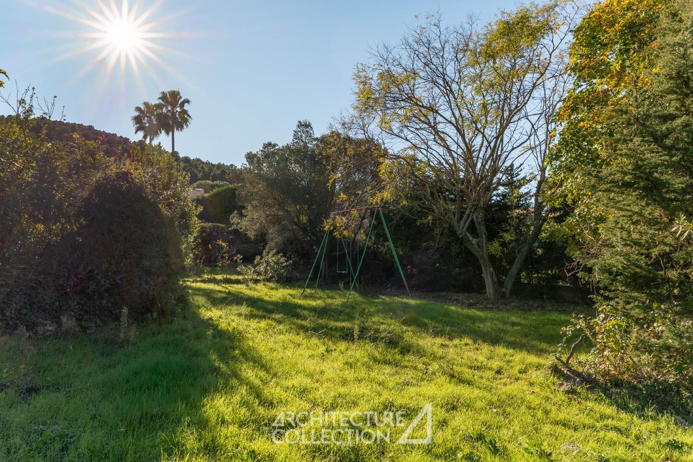 Les extérieurs et le terrain, arboré et majoritairement plat, proposent plusieurs espaces de terrasses, quatre box de stationnement et une végétation méditerranéenne.